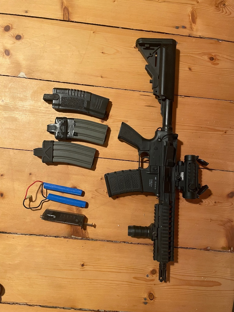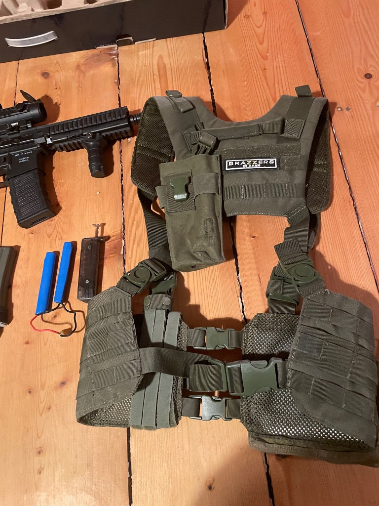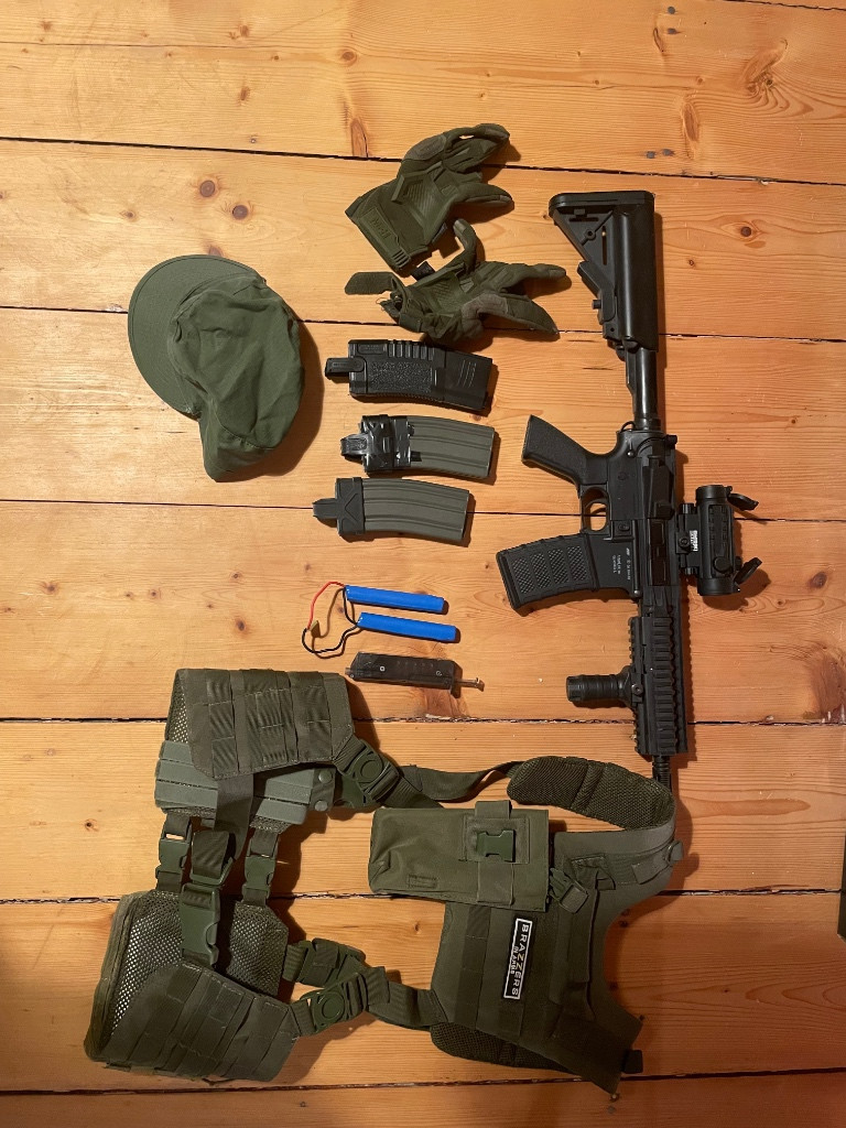 Zdravím, prodám komplet výstroj. ASG M15, 4 zásobníky, red dot zaměřovač, baterie vybitá (netuším jestli funkční nemam nabíječku). Chest rig, sumky na 4 zásobníky, Holster na záložku, sumka na zásobník k záložce + další pouch na kule. rukavica a cepka. Uz se mi to doma valí 3roky nemam na to čas.