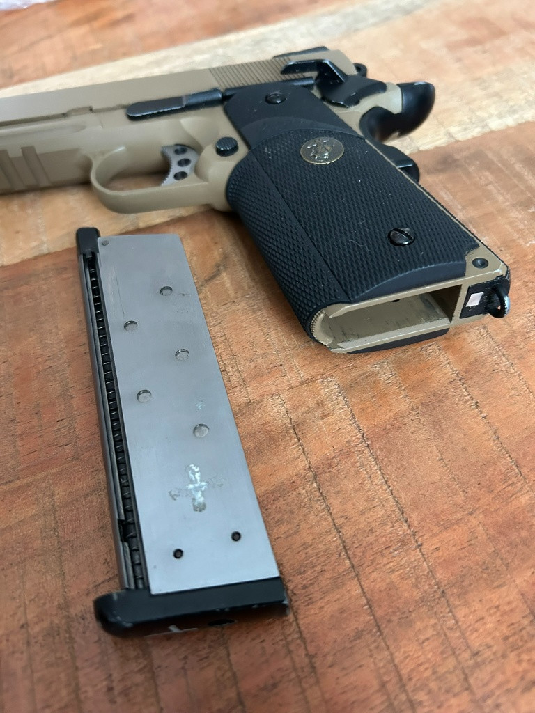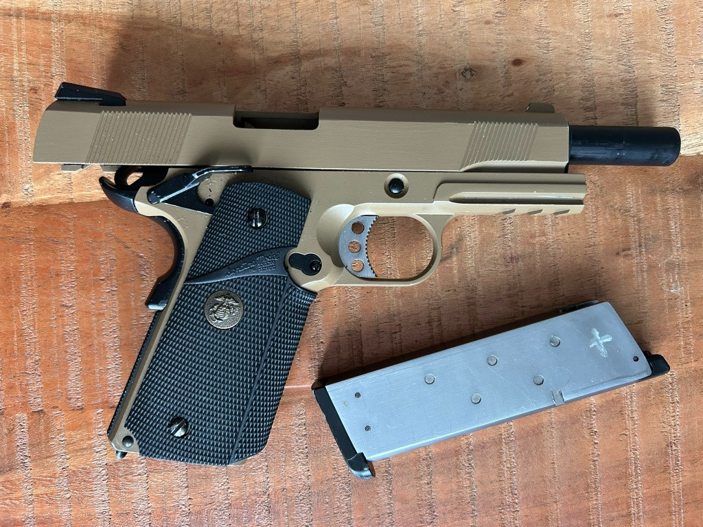 Popis:M1911 M.E.U. SOC RIS - písková, celokov, GBB, WE