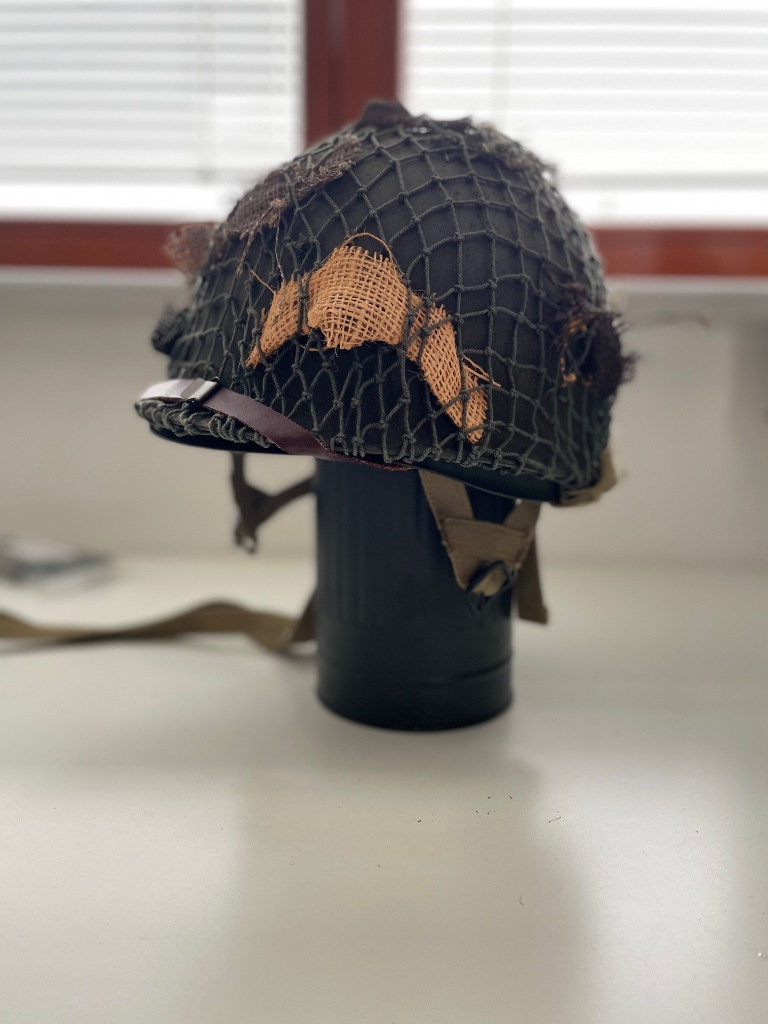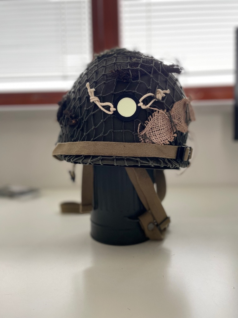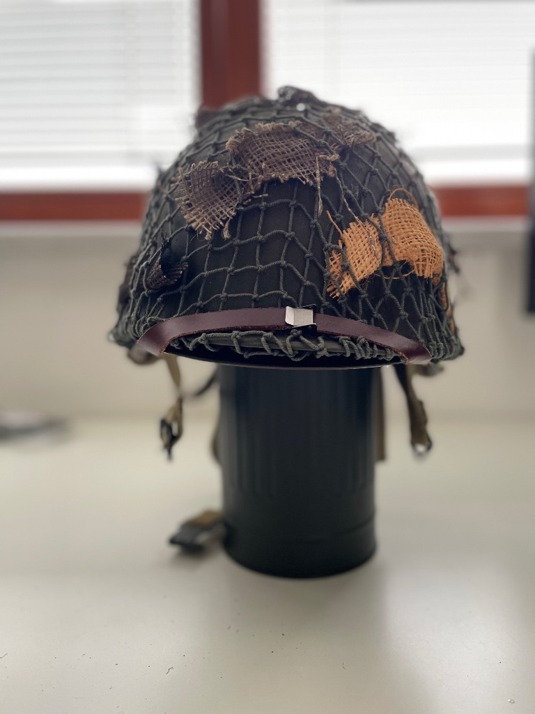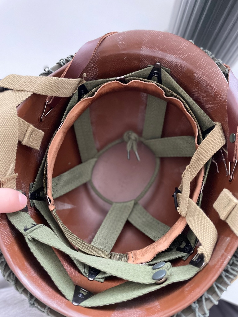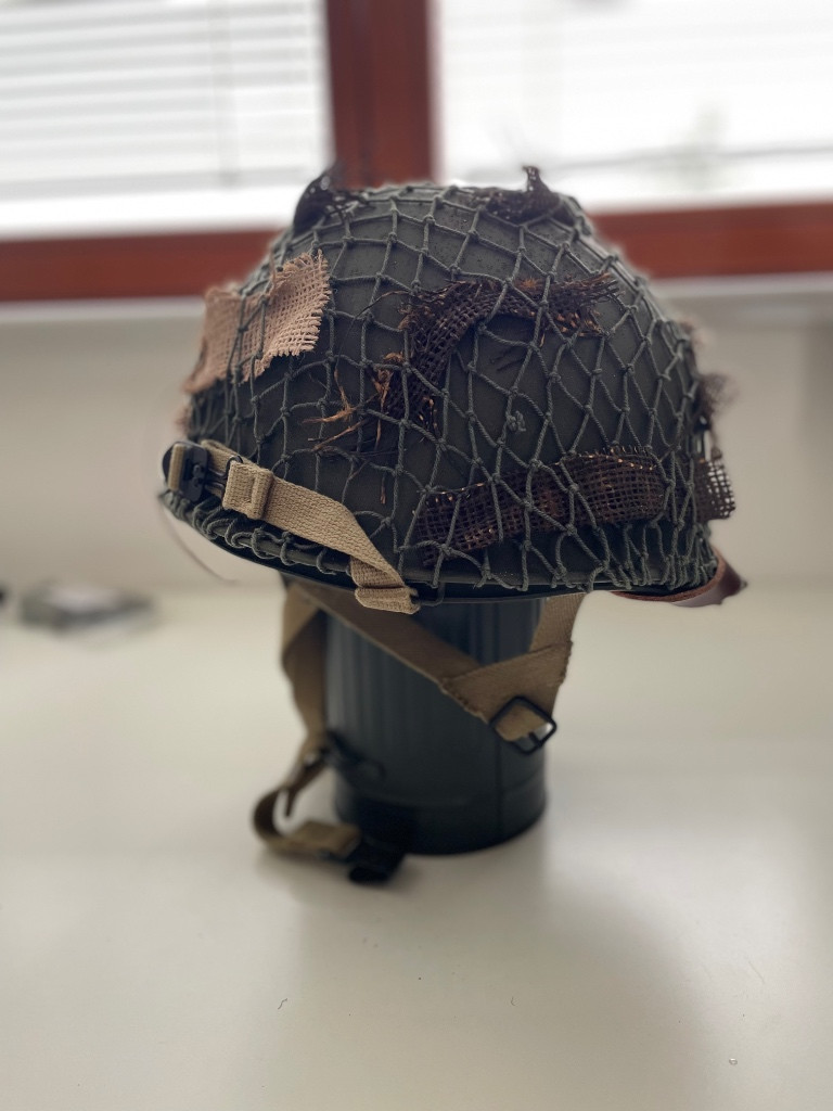 Zdravím, prodám repliku helmy pro americké výsadkáře. Má koncoválečný podbradník, který je vyrobený ze zelené bavlny. Helma má 2 A rámy, kam se uchycoval podbradník. Jsou vyrobeny z kvalitního materiálu a jsou pískové barvy. Zezadu na helmě je speciální plátěný podbradník pro para helmu M1C. Nad ním je luminesční disk, který v noci svítí. Je připnutý na síťce, která je uchycena pod plechem této helmy. Vnitřní liner je z plastu a je obarvený na hnědo, aby imitoval pravý liner. Helma je téměř celá maskovaná pruhy obarvené juty. Na prodej nespěchám, eventuelně vyměním za německé repro ww2 věci. Osobní předání je možné na Praze 5, jinak zásilkovna.