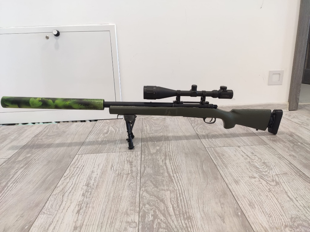 Komplet v airsoft pro upgrade. s 0,43 dava cca 3,3J 125m/s spěchá. 2x zasobnik optika Tlumic je jen nasunuta trubka jinak zbran vypadá standardně .