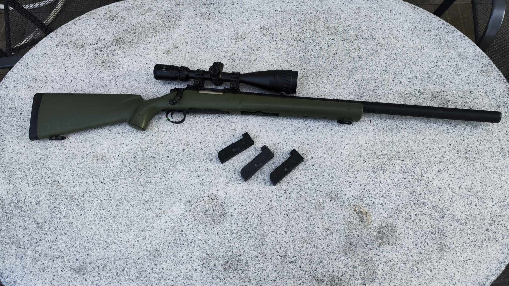 M24 verze vsr Stavene Airsoft divoky zapad....od te doby max 2x na akci. Ve zbrani ML crazy jet hlaven 510mm + Ml gumka TRANSFORMERS DECEPTICONS Pro lepsi vydrz vyroba nekterych dilů: Zachyt pistu Zachyt trnu Konverze na 9mm pruziny Zarazka kulicek v komore ( puvodni zlobil) Zatizeni pístu Uprava dopadove gumy TDC Vymezovaci krouzky na hlaven Raminko komory a pritlak Zavareny valec Nyni vykon 108-110ms na 0.48 Ke zbrani 3x zasobnik Optika theta Mozna dohoda