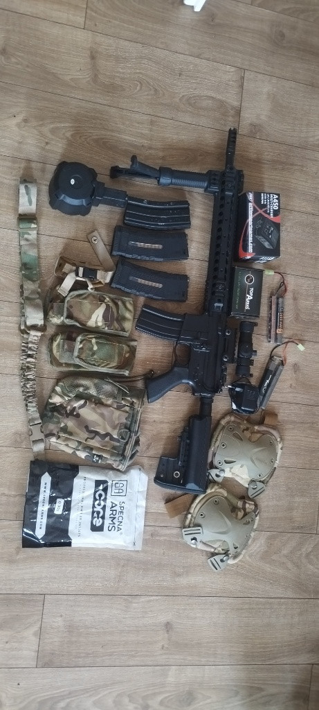 Prodám M4 s příslušenstvím v základu. Bubnový zásobník(kupován na armyburze za 900 malá prasklinka slepeno plně funkční) 2x tlačné zásobníky . 2x točné zásobníky. Kolení chrániče 4x na akci. Vyvýšení optiky. 2x originál britská army sumka na zásobníky v kamufláži mtp . 1x sumka na granát originál british army. 1x nerozbalený pitel kuliček 0.30. 1x origo nabíječka a dvě lepší nabíječky ty jsem nepoužival mám lepší od titanu. 2x baterie 1x turnusový kolimator Discovery je přimontován na jednom montážním kroužku nové kroužky stojí tak 189kč. 1x multicam popruh . 1x rukojeť z dvojnožkou Možnost odběru v Brně nebo zásilkovnou+99kč