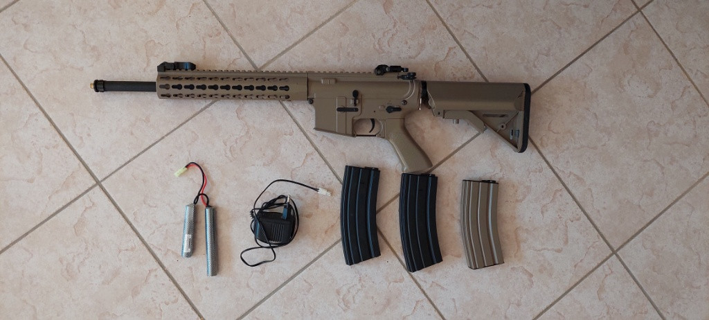 Prodám airsoftovou pušku typu M4/AR15 v dobrém stavu. Zbraň má pouze kosmetické vady typu chybějící ústí hlavně, utržené oko na popruh na levé části zbraně a škrábance. Jinak střílí stále skvěle. Vhodné pro začátečníky a nenáročné hráče. Ke zbrani dodám 2x hi-cap zásobníky na 500 kuliček (kov), a 1x mid-cap na 300 (plast). Oba fungují skvěle. Dále nový akumulátor, použitý 2x a nabíječku. Neváhejte psát či volat, jsem k dispozici skoro neustále.