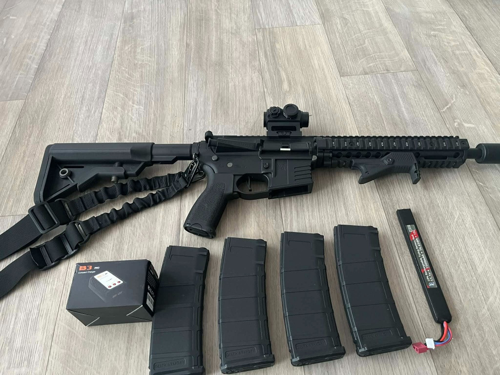 Dobrý den, prodám svou zbraň Delta Armory M4 AR15 MK18 ALPHA ETU. Zbraň prošla lehkým upgradem (delší hlaveň, silnější pružina, tlumič,hop guma.). Je plně funkční, prodávám z důvodu nedostatku času. Zbraň disponuje procesorovou jednotkou. Výkon okolo 1.6J Používaná minimálně, bez viditelných známek poškození. Prodávám bez kolimátoru, ovšem jsou k ní výklopná mířidla. Kolimátor lze dokoupit za 1 000 Kč a ponechat jej na zbrani – v tom případě bude výsledná cena 5 500 Kč. Jedná se o MAVERICK Gen III, S-MIL – černý. Ke zbrani přidám: 4 zásobníky baterii nabíječku doplňky Preferuji osobní odběr a odzkoušení funkčnosti.