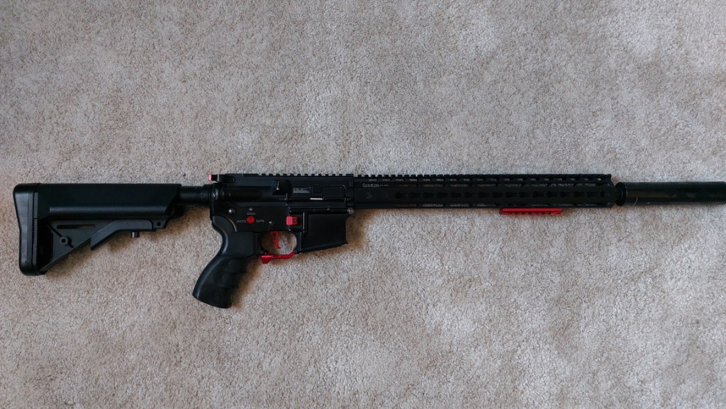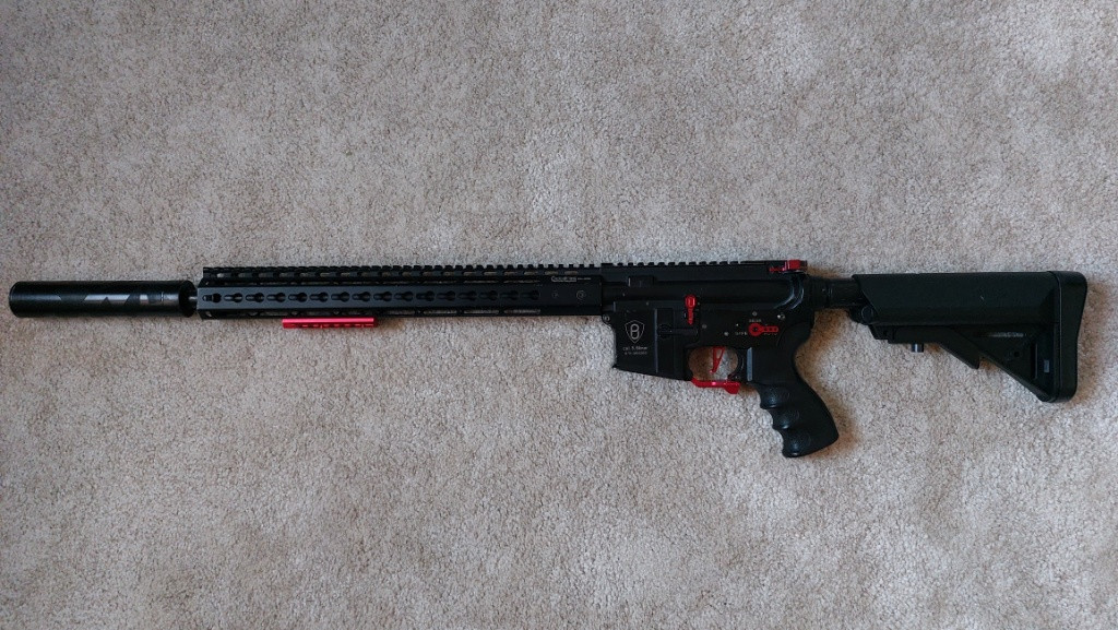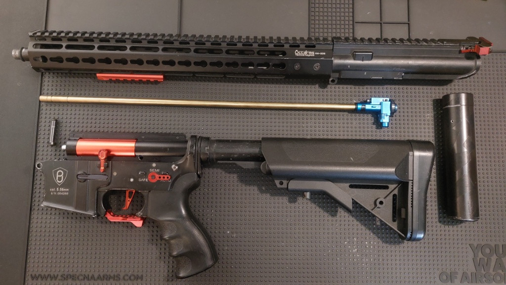 Prodám M4/AR15 full up, tělo od značky P&J (kovové), nové předpažbí keymod, uvnitř RetroArms mechaboch, RA ložiska, kola SA 16:1, vzduchotechnika tlumená shs, motor ASG boost 30k,elektronika Jefftron mosfet+brzda V2 do pažby, prowinhop-up komora, Guarder 6,02mm hlaveň 455mm, hop-up guma Guarder. Tlumič s novou výplní. Aktuálně na pružině M130. Sladěná do červena s doplňky od RA. V případě zájmu prodám i se zásobníky. Prodávám z důvodu nevyužití. S cenou se dá hýbat.