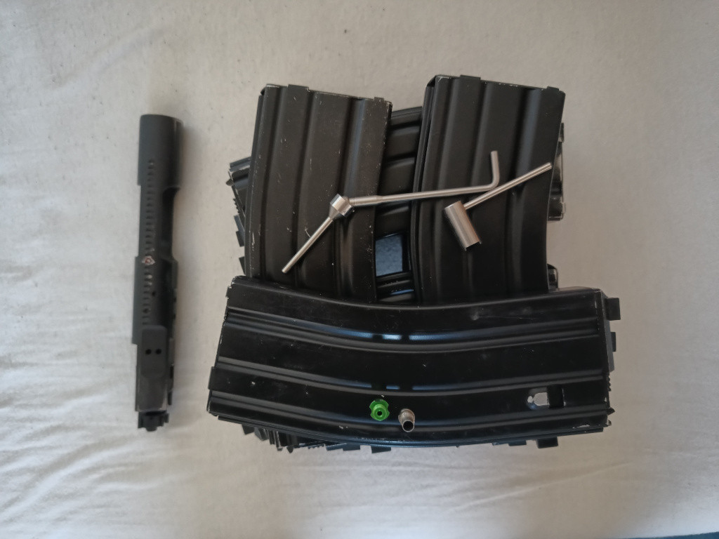 Prodám m4 gbb v up. Ve zbrani je ocelovej ra tech spoušťák, kompletní ra tech pístnice s tryskou s vyměnitelnými hroty trysky a npasem, maple leaf gumička. Zbraň prodávám se 7 zásobníky, původní pístnicí a icerzero tryskou do zimy a příslušenstvím k ra tech trysce. Na vnějšku zbraně jsem vyměnil pažbu za CTR magpul, PTS pažbičku a mlock předpažbí.