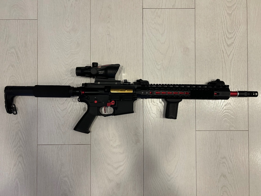 Prodám airsoftovou M4 ASR115X od firmy APS, Zbraň je v bezvadném stavu s úsťovkou 130 m/s a novým zátěžovým motorem, ke zbrani přidám nasvětlovací ACOG s červeným mířením, přední ručku a 45 st. mířidla. Prostě vše co je na fotce + dva APS zásobníky a to celé zašlu v origo krabici. v ceně není zahrnuto poštovné a balné (většinou 180 kč)