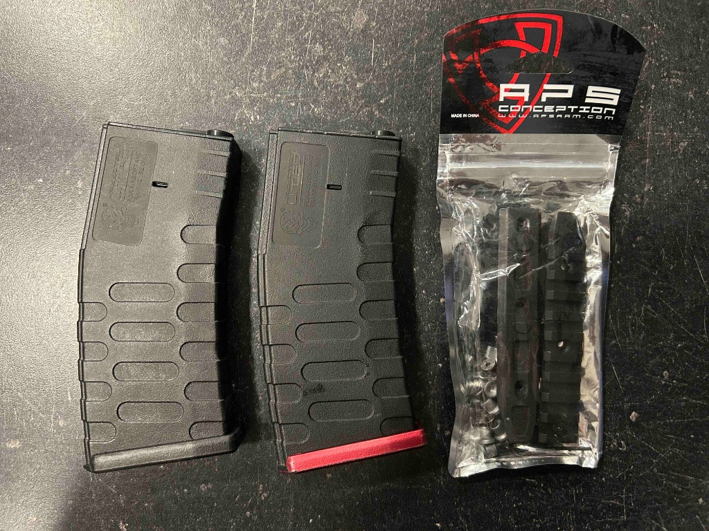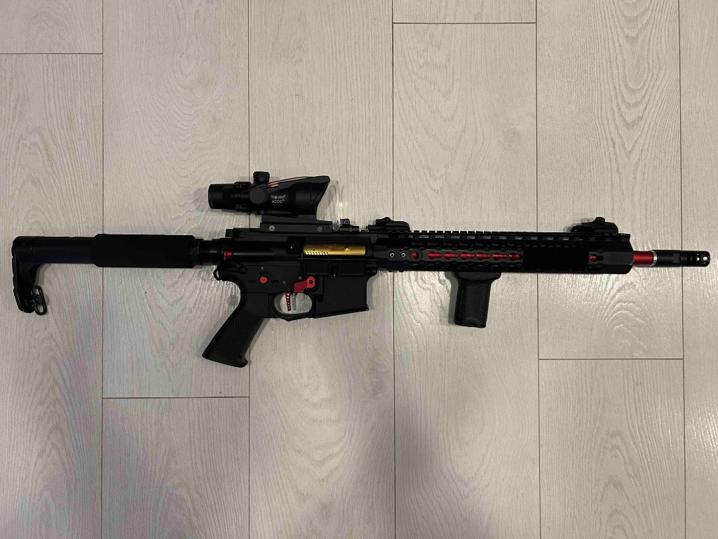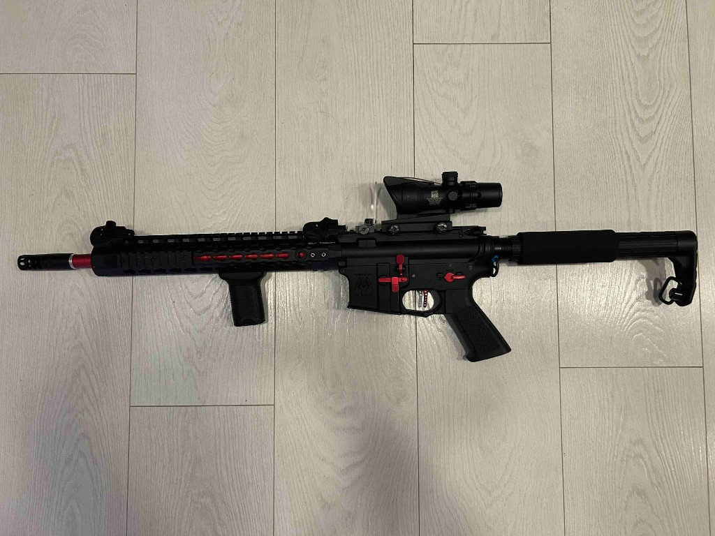 Prodám airsoftovou M4 ASR115X od firmy APS, Zbraň je v bezvadném stavu s úsťovkou 130 m/s a novým zátěžovým motorem, ke zbrani přidám nasvětlovací ACOG s červeným mířením, přední ručku a 45 st. mířidla. Prostě vše co je na fotce + dva APS zásobníky a to celé zašlu v origo krabici. v ceně není zahrnuto poštovné a balné (většinou 180 kč
