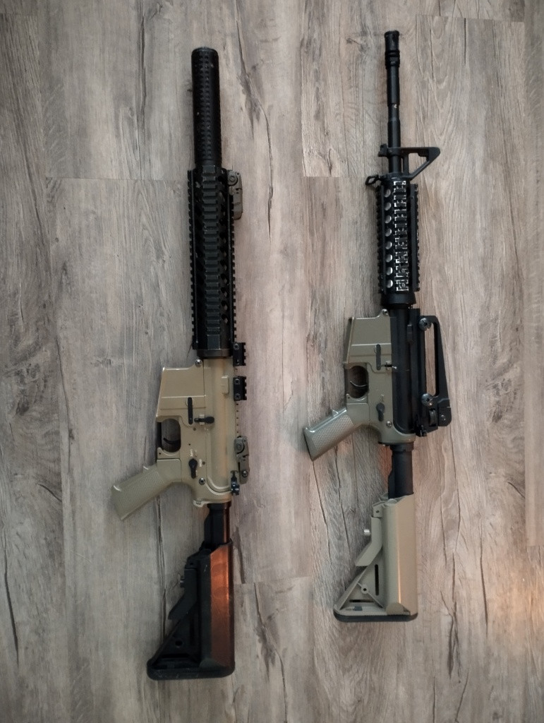 Prodám dvě M4. Kratší je skládaná ze dvou zničených zbraní a nefunguje na ní semi. Druhá delší písková je nejspíše CYMA, v ní je lehký up. obě zbraně dávají kolem 1,5J. Skládanou prodám za 1000 a pískovou CYMU za 3000. Při rychlém jednání a odběru obou zbraní půjdu o 500 níž. Ke každé zbrani přidám 2x točný zásobník. Při zasílání přes poštu poštovné hradí kupující avšak nejlépe bude osobní předání.
