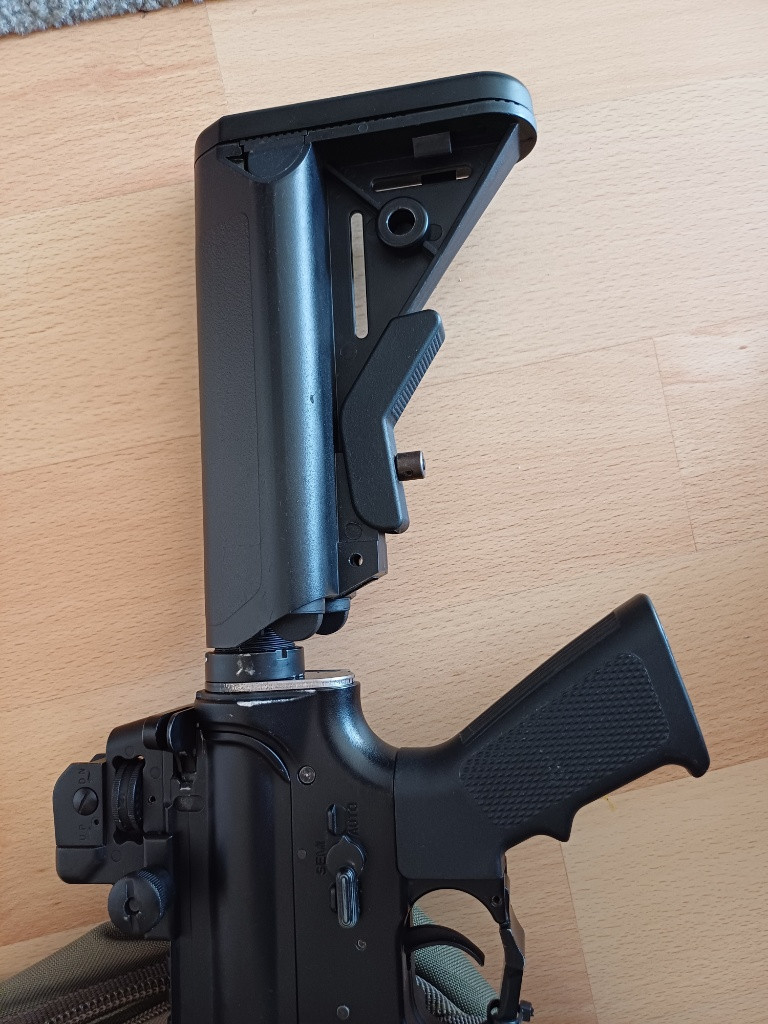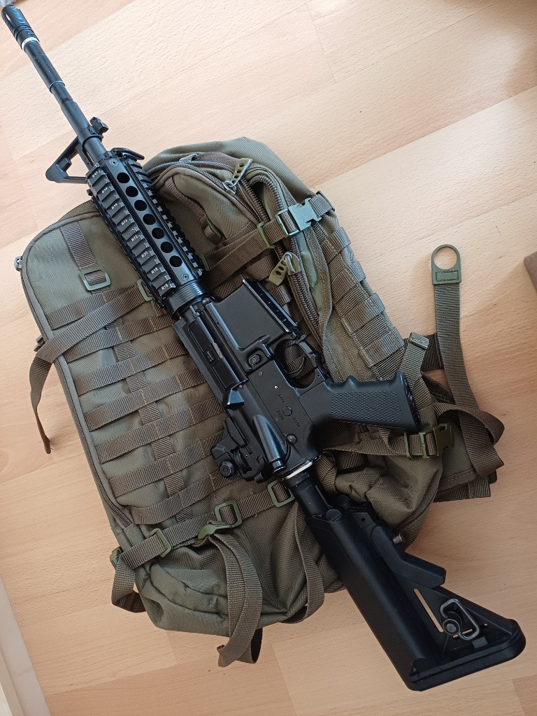 Zdravím, prodám M4. Původně od APS, ale ten jejich stupidní blowback šel pryč a uvnitř je píst s kovovým hřebenem a vzducharna od SHS, hopguma SHS 60° a přesná hlaveň Shooter. Dává ~1.8 J s 0.3g a ~12 rps s 2S baterkou. Má crane opěrku, takže se tam krásně vejde i 3S baterie a kadence pak vyleze k 20 rps. Není moc ošoupaná, akorát tlumič záblesku je na spodní straně trochu štíplý.