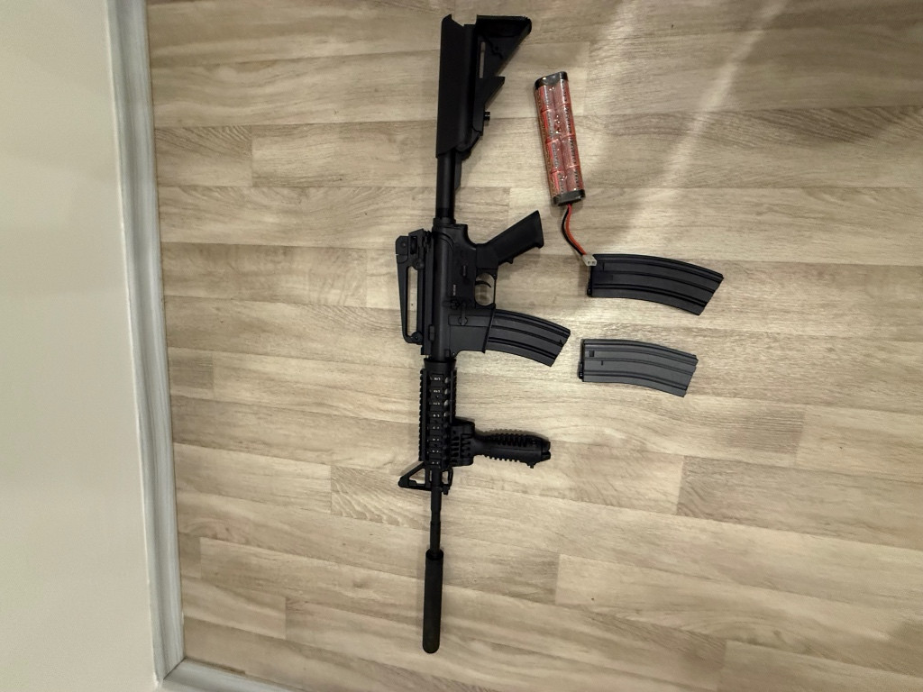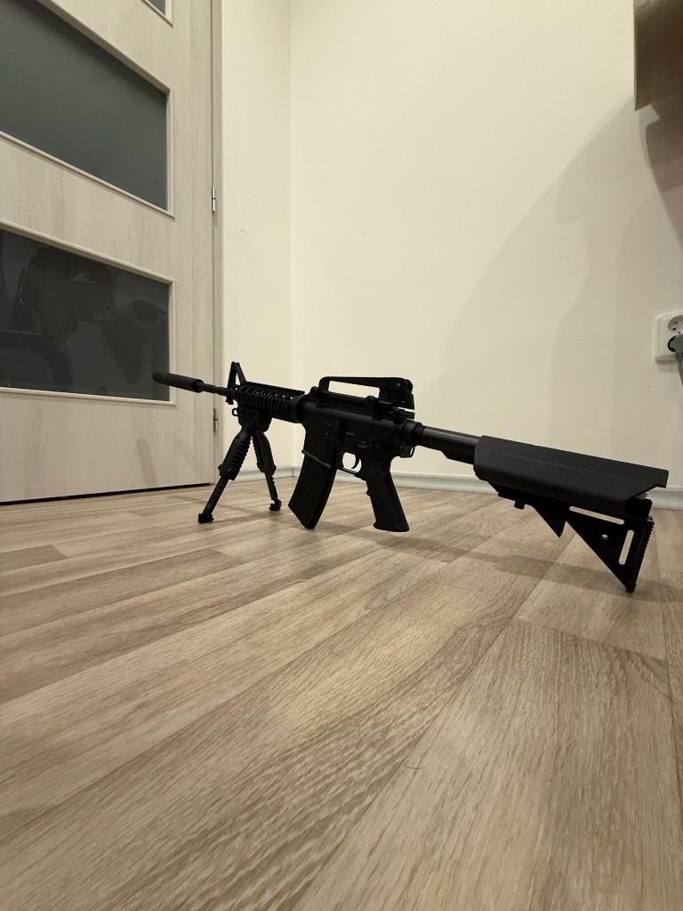 Zdravím prodám M4 Měl jsem ji asi na 4 akcích a teď se mi na ni doma akorát práší a je ji škoda přešel jsem na HPA Ke zbrani dam 3 točáky větší baterku nabíječku Původní cena byla 4980,- + jsem dokoupil baterku a ty zásobníky a tlumič Pak tu mam ještě 3 tlačily na Ak V případě zájmu piš na WhatsApp