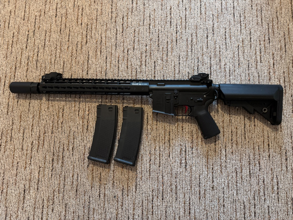 Nabízím AR/M4 od Specny. Zakoupena a servisována v Airahard.cz před 4 roky, zároveň proběhl lehký upgrade, později došlo ještě na další upgrady do stádia, kde je zbraň komplet upravená. Aktuálně je zbraň sestavena na 1,7J při 0,28g kulích, na přenost, dostřel a spolehlivost. Všechny faktury od servisů mohu doložit. Kabeláž v tubusu pažby s konektorem Dean, pohání to celé 11,1V baterie LIPO. Nikdy jsem s ní neměl problém. Vevnitř: SHS superzátěžová kola, Epes tryska, action army hliniková hlava válce, SHS ramínko podavače, ASG motor boost 30000, Gate titan procesorovka s cnc spouští Maxx model, RA píst s ocelovým hřebenem, Epes hlava pístu, Válec SHS nerez, Maxx model komora s ML precizní hlavní a hop gumkou ML super macaron 60 a další. Vnějšek: Celokov tělo, PTS pažbička, octaarms předpažbí tuším 13,5". Ke zbrani kompenzátor s QD tlumičem WARDEN 14mm levotoč, 2x zásobník mid cap na 120bb, 2x baterie lipo, načatá láhev kuliček 0,28g GG a drobotina jako přídavné lišty na keymod, přední grip. Od posledního servisu v roce 2023 odehrála pouze pár her a celkově má málo nastříleno. Zbraň bez investic.