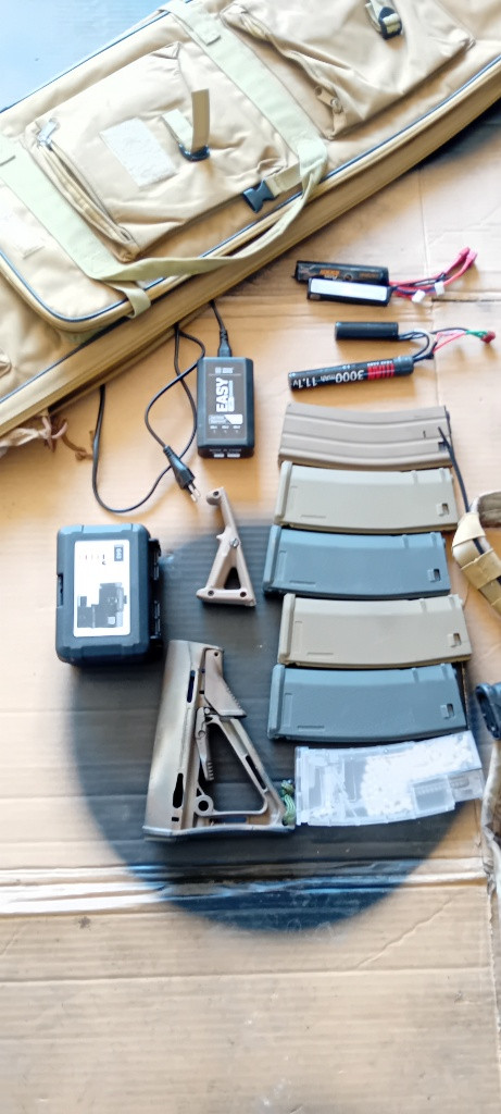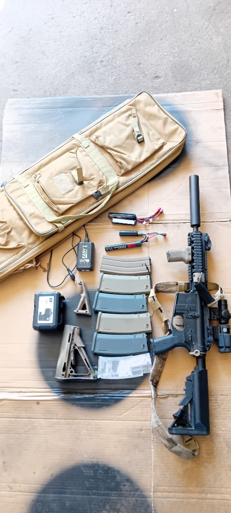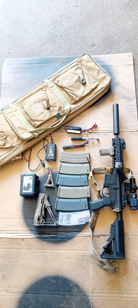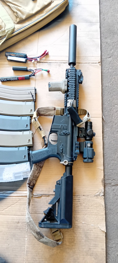 Nabízím k prodeji specna arms m4 viz foto. Zbraň je v upgradu tak, aby fungovala. RA cnc skelet, shs vzduchotdchnika, epes tryska, ml guma, omega přítlak, gate aster jednotka. S 0.30g dává 1.7j takže je na většinu akcí ready. Ke zbrani vše co je na foto= zbraň, tlumič, grip, kolimator theta optic, sklopná optika, QD, popruh, sklopná mířidla, magpul pazba, grip, 4x tlačak, 1x točák (šnůrka), plnička, nabíječka, 3x 11.1 lipol, pouzdro na zbraň. Tak jak je je plně funkcni a netřeba s ní nic delat, max zastřílet na zvolenou gramáž. PC kolem 20k, Komplet nechám za 9000 s osobním odběrem v Prostějově.