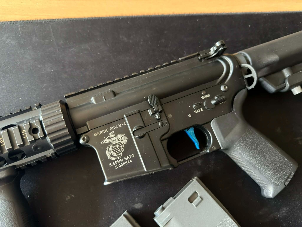Prodám z důvodu nadbytečnosti m4 od specny s pěkným upgradem. Puška má 1,55joule s 0,28. Seznam dílů : Zátěžový motor EL M170 Jefftron procesorovka leviathan optical shs kola 16/1 pružina m110 asparts ramínko shs válec ocel shs zesílená pružinka ramínka icp hlava pístu epes pom aoe píst retro 14,5 ocel zub tryska epes het hlava válce shs v2 komora prime presna hlaven prime nerez 6,03 gumička prime flathop ke zbrani 2x zásobník tlačný smag, rukojeť. Pažba je EL. Pažbička magpul style od SHS. Puška je čerstvě po servisu v airhardu. Střílí krásně! Připravena rozsévat plast! Neměním, osobko Třebíč nebo PPL.