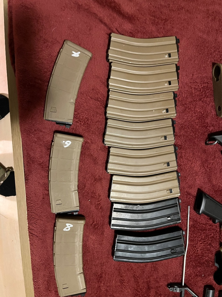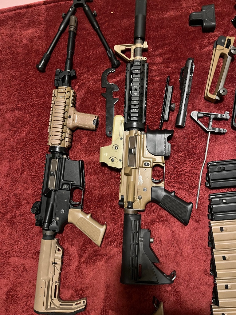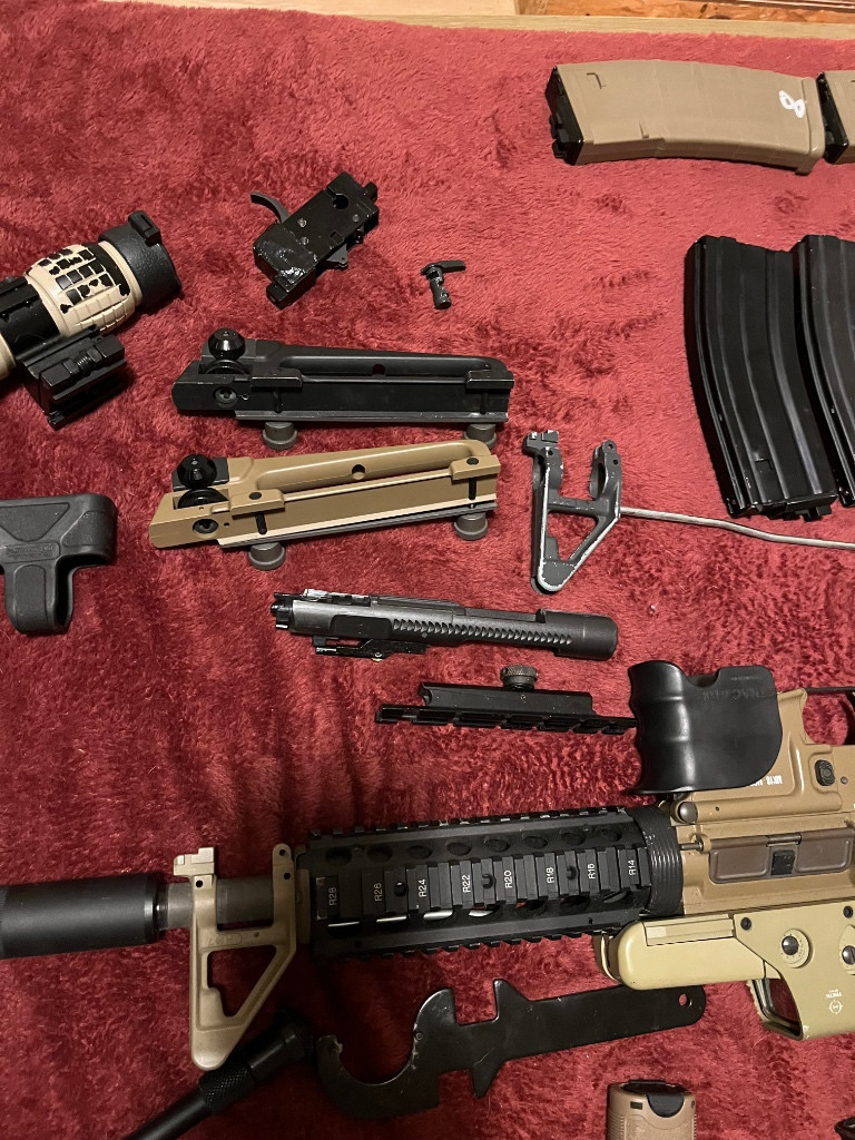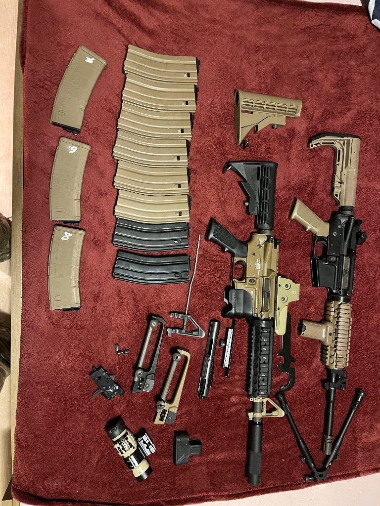 Prodám vše tak jak je na obrázku preferuji vše dohromady. 2x m4 We 2gen,11 zásobníku 10 je klasickejch plynovejch,1 na co2 . V černé závěr Ratech s npas tryskou, tanová v základu a časem je potřeba vyměnit opravit spouštak sem tam zlobí přepínání nejspíš ošoupaný záchyt kladívka nebo nevím nechce se mi řešit přidám ještě 1 orygo bolt se základní tryskou plus věci co jsou na obrázku. Cena kompletu cca 14k (rozumné domluvě se nebráním) Více info po telefonu