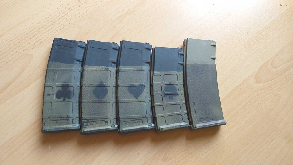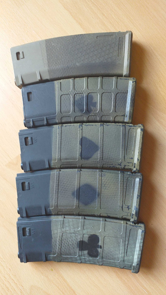 Prodám M4 tlačné zásobníky. První 3 z leva jsou delta armory. 4 z leva nevím. 5 z leva je Specna Arms.