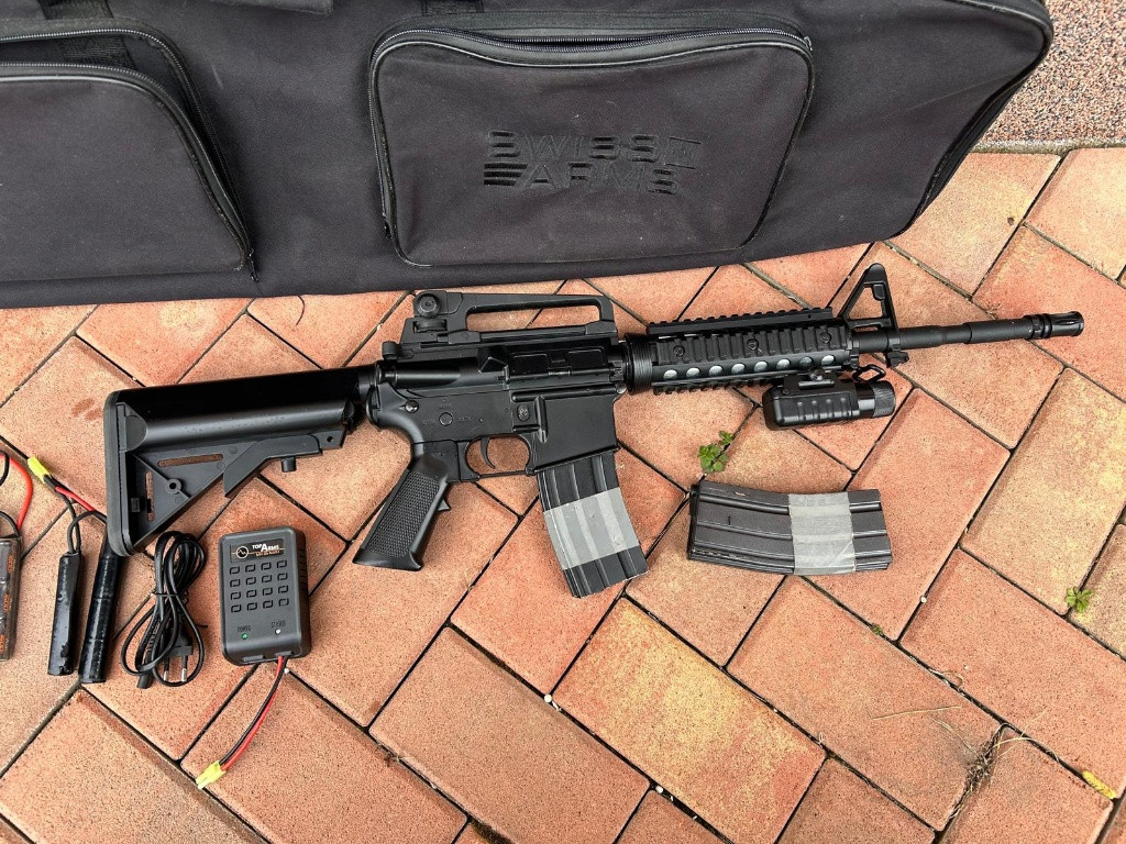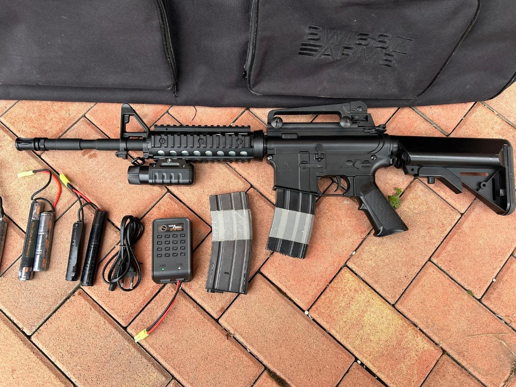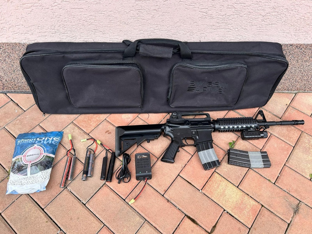 Prodám M4A1 RIS, tělo plast, plně funkční, má oko na jednobodový popruh, přidám k ní 2x točný zásobník, svítilnu, 3x baterii, nabíječku, nerozbalené kuličky 0,25g a transportní obal na zbraň. Prodám pouze jako komplet. Cena 2200kč
