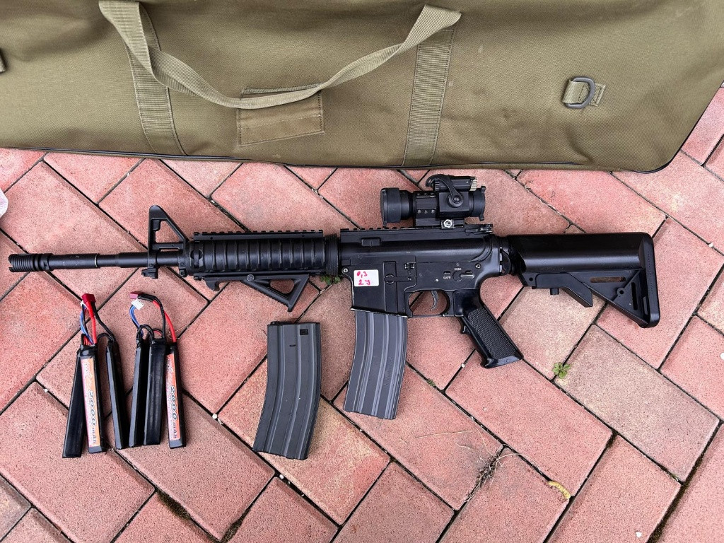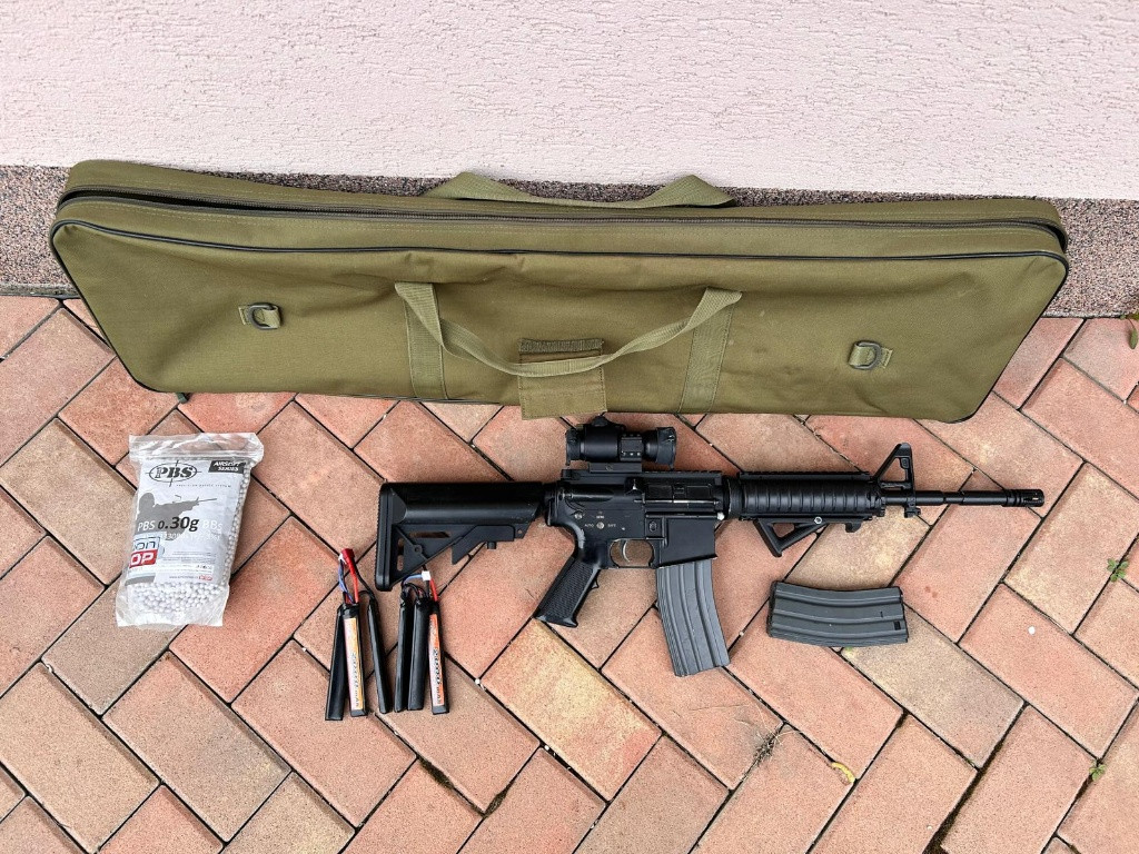 Prodám M4A1 RIS, celokov, plně funkční, má oko na jednobodový popruh, Prowin komora, mechabox v upgradu, píst, hlava, pružina, trn, možná i kola, už si nepamatuji. Má 2J na 0,30g. Přidám k ní kolimátor, 2x točný zásobník, grip, 2x Lipol baterii 11.1V, nerozbalené kuličky a transportní obal na zbraň. Prodám pouze jako komplet. Cena 3500kč