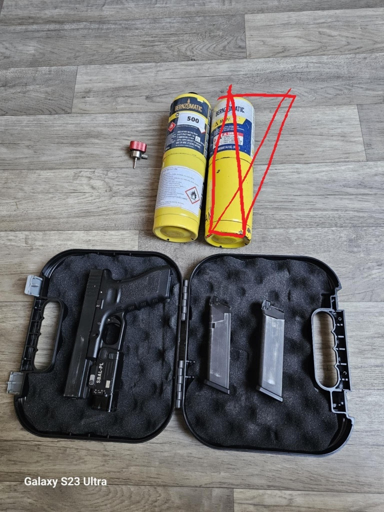 Na glockovi je vyměněný závěr za kovový od Guarderu ,pistnice, housing glock , trn ,hlava pistnice, lozisko kladiva, hlaven , hop guma a kolečko. Osazen je svítilnou SBAL - PL která je vybavena laserem a stroboskem. Ke Glockovi dávám jeden zásobník, kufr, 1 bombu propylenu + plnicí redukci ( bomby a redukci klidně prodám zvlášť) . Co se ale určitě s Glockem prodá je kydexové zakázkové pouzdro od RH holsters. Pistole je po servisu v AirHardu a připravena pro nového majitele. Nebráním se výměně.