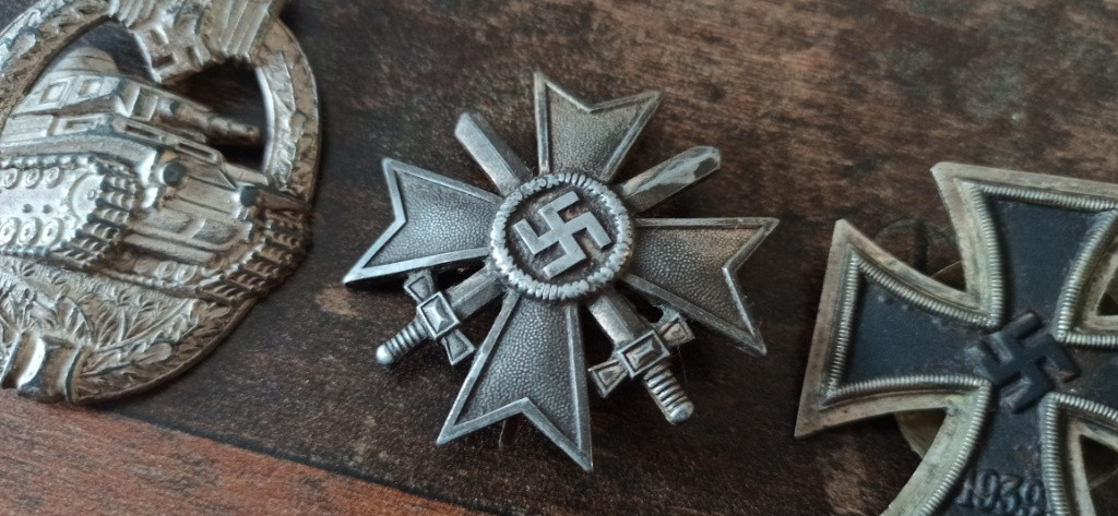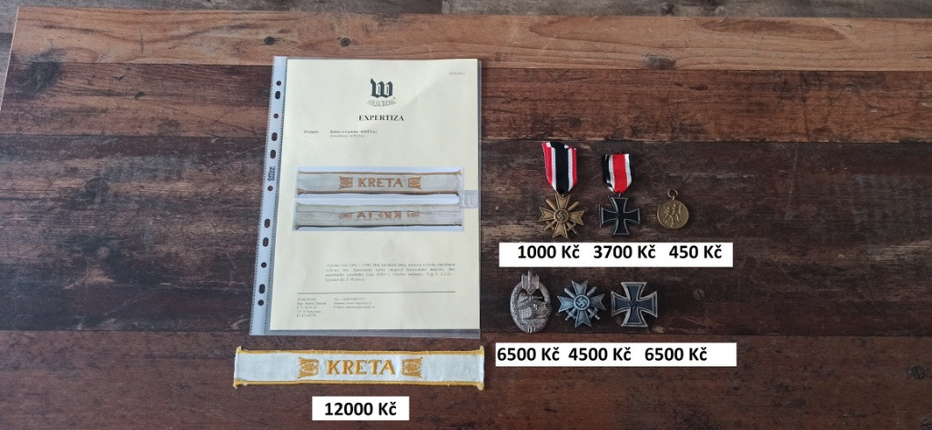 Prodám originální Německo medaile odznaky a vyznamenání. Ceny jsou uvedeny níže. Ruším sbírku. Více fotek mohu poslat do emailu. Koukněte i na mé další inzeráty. Odešlu balíkovnou, cena dopravy 90 Kč. Není problém ani osobní předání. Na prodej: Rukávová páska Kreta. Expertíza Warcross. Cena 12000 Kč. Železný kříž 2. třídy 1939. Výrobce 55 J. E. Hammer & Söhne Geringswald. Cena 3700 Kč. Železný kříž 1. třídy 1939, vzácnější varianta zachycení šroubem. Cena 6500 Kč. Odznak pancéřových granátníků a tankových posádek ve stříbře. Značeno A.S. Výrobce Adolf Scholze Grȕnwald. Cena 6500 Kč. Záslužný kříž 1. třídy s meči, značen L/15, výrobce Otto Schickle Pforzheim. Cena 4500 Kč. Záslužný kříž druhé třídy s meči. Cena 1000 Kč. Medaile za obsazení Sudet bez stuhy. Cena 450 Kč.