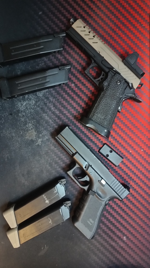 Vorsk 4.3 Hicapa s kolimátorem, MeapleLeaf hop komorou a dvěma zásobníky (pc 5940kč) - 3300Kč WE Glock 17 MOS Poseidon hop komora s hlavní a dva zásobníky (PC 5950kč) - 3300kč Batoh ATACS -500kč