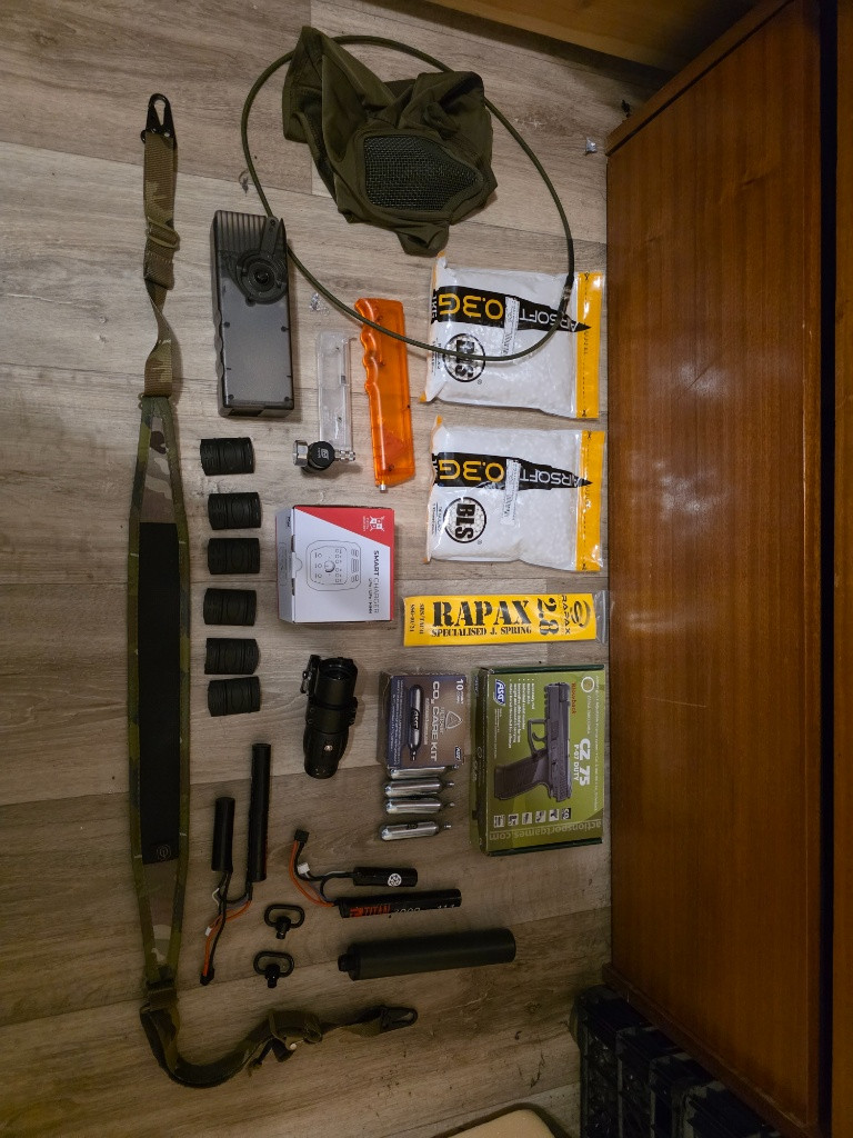 Zdravím prodám pár přebytku ceny dohodou 2x nové BLS 0.30g kuličky Velká plnička Malá plnička Rychloplnicka pro M4 6x gumová krytka RIS listy Smart nabíječka Delta Armory Rapax pružina na 2.8J Magnifer 2x Titan baterie 11.1 3009mah (T-dean) Kukla s maskou (Oliva) Popruh multicam Tlumič Regulátor Mancraft + hadice Plynová pistole cz75 dutý P07 14x CO2 bombocky Při větším množství neni problem udělat cenu
