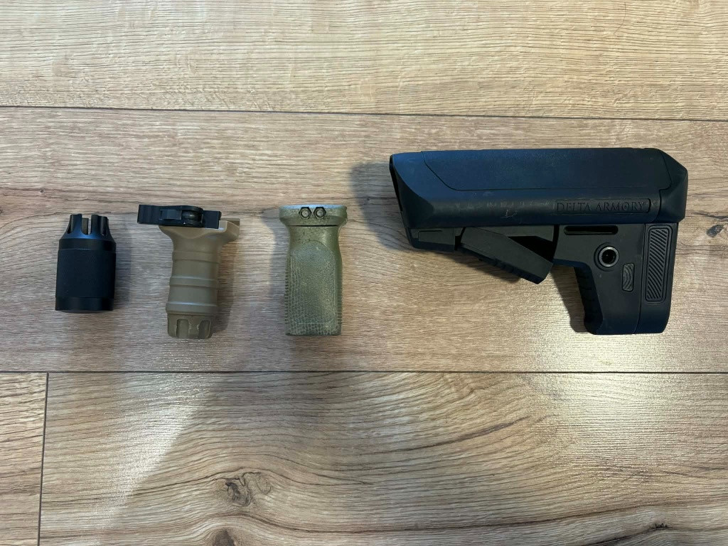 Prodám pažbu delta armory, 2x vertikální grip a kompenzátor. 150/ks, celek 500. posílám přes zásilkovnu, poštovné hradí kupující