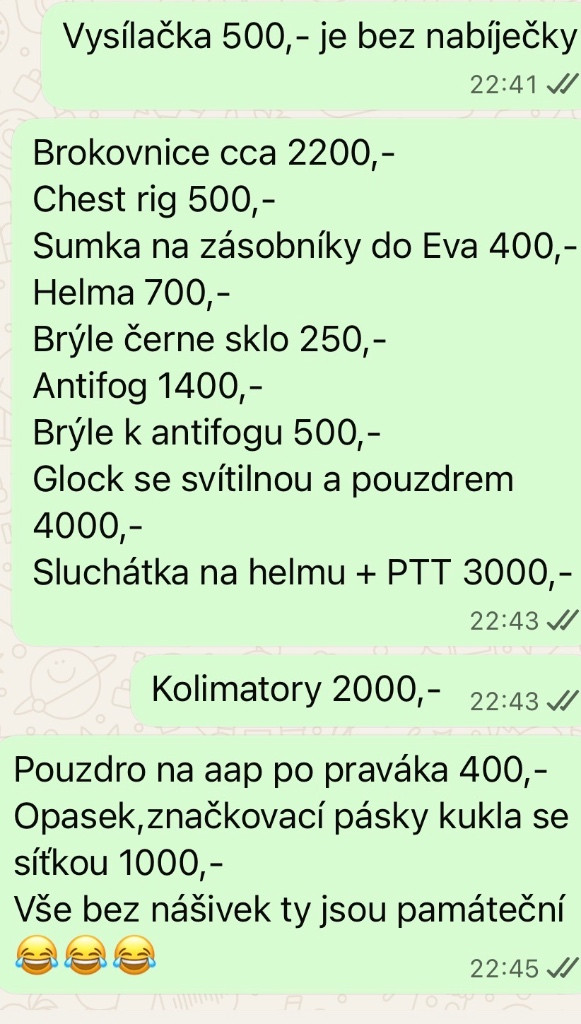 Zdravím prodám většinu svého vybavení na airsoft věci jsou nové a použité na jedné akci bohužel účty ani nic podobného k tomu nedohledám celková cena u první fotky je 16350,- jelikož na to spěchám tak to nechám za 8500,- zbytek fotek pošlu do zprávy prosím psát na whatsapp