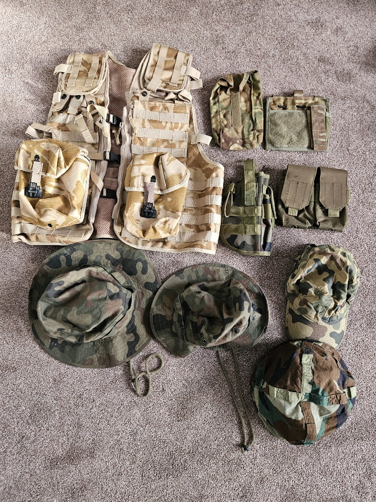 Prodám různé vojenské veci. Britská vesta DPM desert se dvema sumkama 350Kč Flap pouch MTP 90Kč Commander pouch MTP 90Kč Dvojsumka na M4 zásobník 90kč Pistolove pouzdro univerzální wz 93 180Kč Obal na helmu 50kč Čepka wz 93 100Kč Klobouky wz 93 po 150Kč/ks Osobní předání Vítkov/Opava Poštovné 99Kč