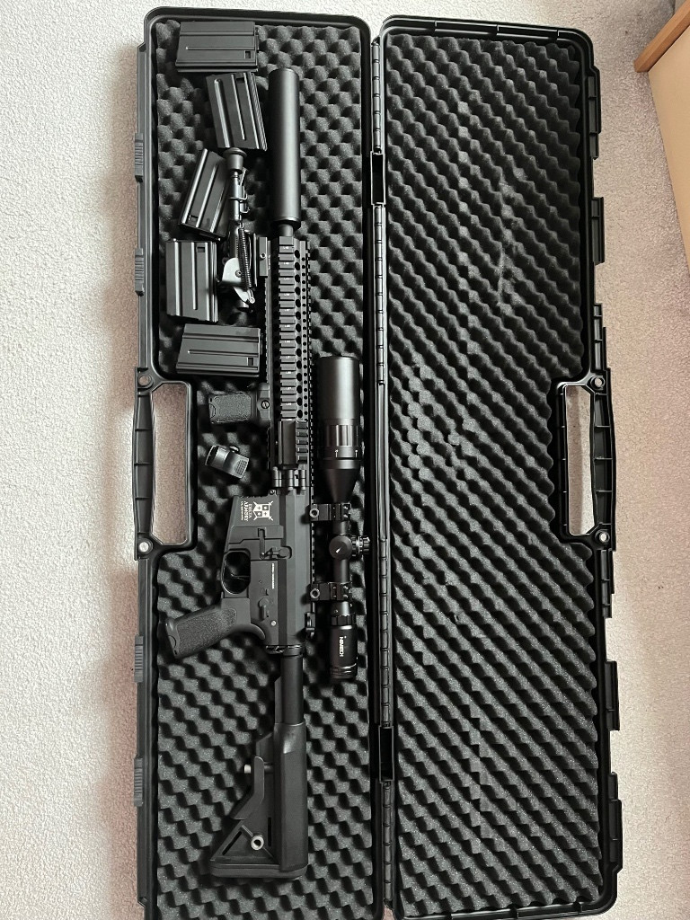 Dobrý den prodám svoji mk 18 s daniles defense DD předpažb. Základ zbraně je Mk18 Delta armory ETU. Zbraň je teď funkční a dává 1.6 -1.7 J, jen občas špatně podá. Zbraň byla myšlena jako projekt. Má teď i prodlouženou vniřní hlaveň, takže musíte hrát s tlumičem. Ke zbrani přidám optiku Novritsch MK1 + theta optics red dot + dvojnožku + tlumič + 5 tlačných krátkých zásobníků. Zbraň je nedokončené DMR