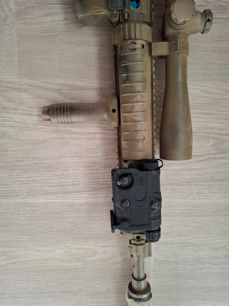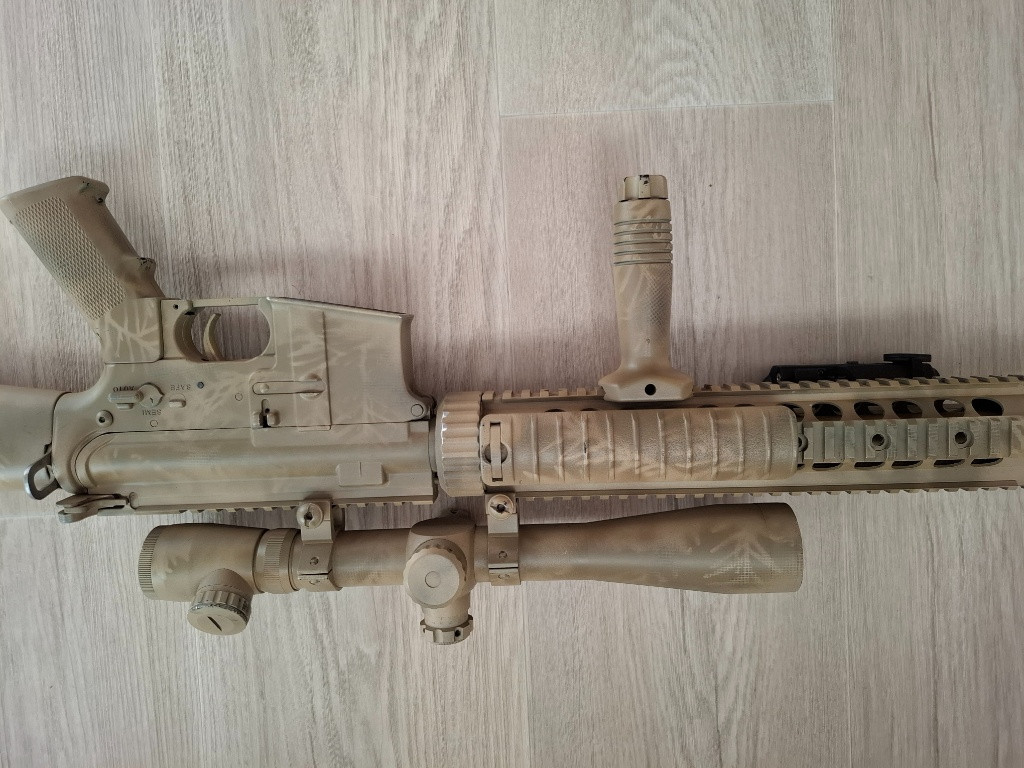 Prodám tuto airsoft zbraň MK12 SPR mod 1. 2 roky již leží ladem, tělo Aimtop, predpazbi Čína, ústí hlavně s tlumičem KingArms, tělo zajištěno předním Magicpinem, optika fake Leopold. Uvnitř pokud si pamatuji SHS hliníkový mech, kulickova loziska, zátěžový SHS kola, SHS zátěžový motor, pružina 150, vzduch SHS, přesná hlaveň, Jefftron procesorova spoušť, modrá Prowin hop komora, hop gumička netuším nejspíše MapleLeaf. Ke zbrani tlačný a točny zásobníky, LiPo baterka, černé transportní pouzdro, PEQ box funkční. Mozno i s chestrigem. Zbraň dávala kolem 170 m/s. Více info na mailu. Bez PEQ boxu
