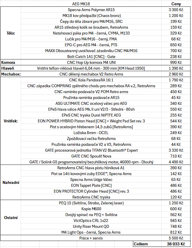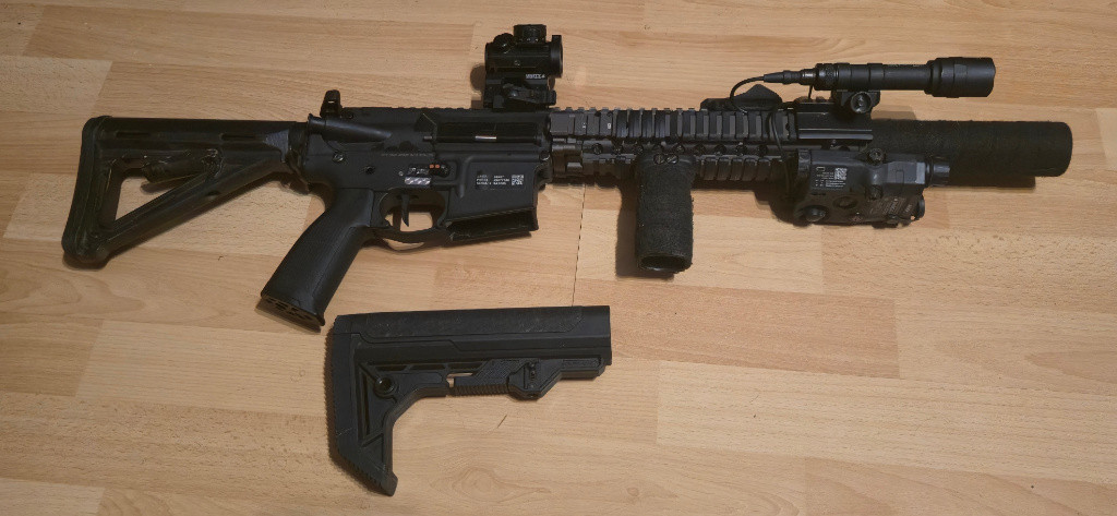 Zdravím, prodám MK 18 AEG. Před cca 14 dny bylo v servisu (údržba před zimou a výměna vzduchotechniky). Tělo je polymerové. Předpažbí je kovové ve stylu MK18, myslím, že od Madbullu. Po výměně vzduchotechniky je to spíše takové DMR. Druhou vzduchotechniku k tomu přidám. S ní jsem měl okolo 2,4-2,5 J na 0,28 g a okolo 1,8 J na 0,43 g. Po výměně, jak je vidět, se dost zlepšil výkon na 0,43 g. Pažba je bohužel stříknutá černým sprejem, proto k tomu je i ta druhá. Hlaveň končí v tlumiči. Motor se dával jako jeden z posledních, takže má do 3 tisíc nastříleno. Všechno jde nastavit přes aplikaci od Gate. Prosím jen normální nabídky. Rovnou napište cenu co za to chcete dát. Chci spíše jen prodej. Prodaváno jako celek - všechno co je v seznamu. S Airsoftem končím.
