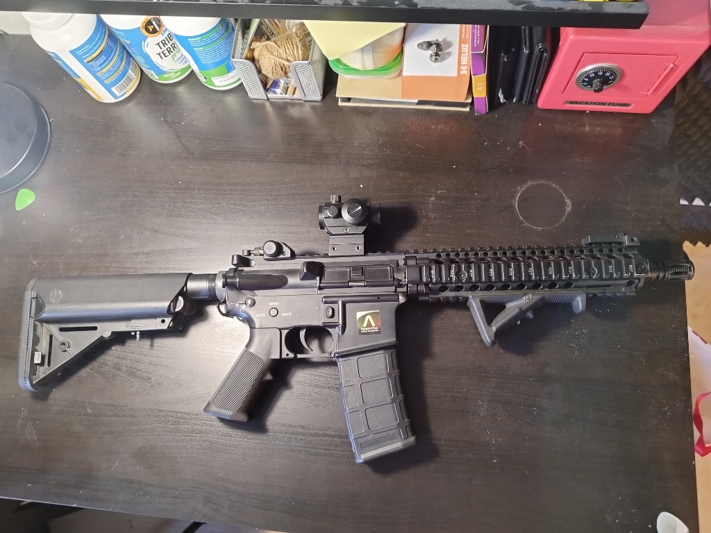 Prodám svou E&C Mk18. Ideální balíček pro začínajícího hráče. Zbraň je v mírném upu (MF hop guma 60´ , Tryska s o- kroužekm Epes, Zpožďovací vačka, Podložky kol.) Vše je utěsněno nejlépe, jak šlo. Má na sobě pár bojových šrámů, ale kromě chybějící páčky na pažbě nic, co by vadilo funkci. Ve zbrani je solidní mechabox, který je dobrým základem pro budoucí upgrady. V ceně nechám s tlumičem, kolimátorem (potřebuje novou baterii, jinak funguje), grip, 4 točné highcap zásobníky, Pružinu m110, montáž se svítilnou, dvě odpovídající TopArms baterky a nabíječku. S cenou jsem ochoten hnout.