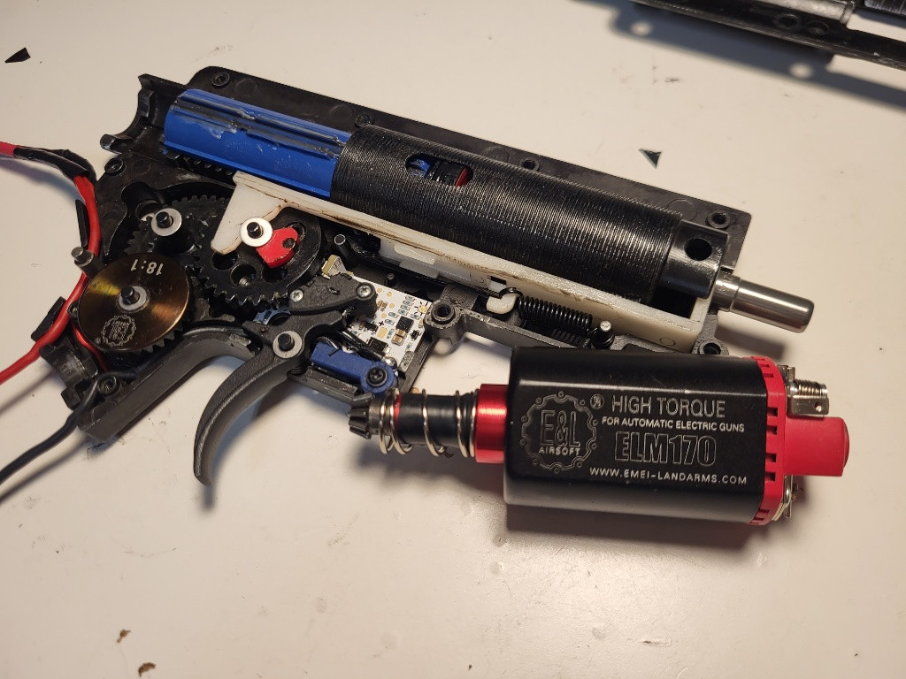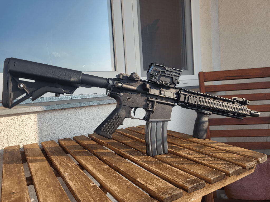 Prodám MK18 od E&L verze platinum. Uvnitř E&L M170 zátěžový motor. CNC 18:1 kola E&L. Procesorovka Perun V2 Hybrid. Epes tryska 21,4mm. Hlava válce a válec jednodílné ocelové od E&L. Píst origo E&L/SHS s původní tichou hlavou pístu. Mechabox origo V2 zesílený od E&L. Hop up komora typu Prowin origo od E&L. Hop up gumička Pegasus fialová. Hlaveň základ. Omega přítlak. Zbraň vypodložena, přetěsněna a promazána. Doraz hop up komory k mechaboxu. Zbraň dává 1,6J s 0,3g. Na poměry AR15 replik velice solidní kus. Ocelová vnější hlaveň, gas blok, mířidla, spoušť atd. dávají zbrani v ruce velice solidní pocit. Pár oděrek z používání se najde. Záchyt závěru funguje, avšak vyhazovací okénko má otočenou pružinku, aby zůstávalo vždy zavřené. Prodávám bez kolimátoru!!! Pouze s ručkou, krytkami RIS a ocelovými mířidly. Dále přidám původní krabici a dva plechové stanagy, z nichž jeden by měl být určitě původní E&L. Druhý si nejsem jistý. Předání možné v Praze nebo při platbě poštovného předem možné poslat přes zásilkovnu či podobné služby. Malá sleva při solidním jednání možná na místě. Prodej z důvodu redukce sbírky.