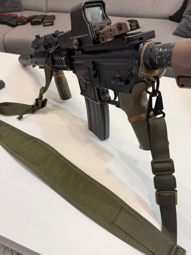 Dobrý den, nabízím k prodeji nebo k výměně moji dlouholetou pušku MK18 od E&C, tělo je krásně zpracované - celokovové, od základu zbylo pouze tělo a předpažbí. Z venku: Kopie PTS pažba, ergonomická pistolová rukojeť, tlumič s rychlomontaží, eotech 551, dummy anpeq 15, rukojeť. 2 kovové zásobníky a 6 plastových zásobníků Guarder. A popruh ( kopie ferro concept) Zbraň má uměle vytvořenou patinu. Vevnitř: celokovový mechabox, v něm všechno vyměněné ale bohužel si již značky nepamatuji, momentálně by tam měla být 140 pružina, vysokozátěžový motor, mosfet, t-dean konektor, prowin komora a vyměněná gumička a hlaveň. Prodám tak jak je na fotce, případně zvlášť pokud bude zájem. Pořizovací cena je přes 20 000,- kč, prodám rozumné nabídce nebo výměně za něco v podobné cenové kategorii nebo s oboustranným doplatkem.