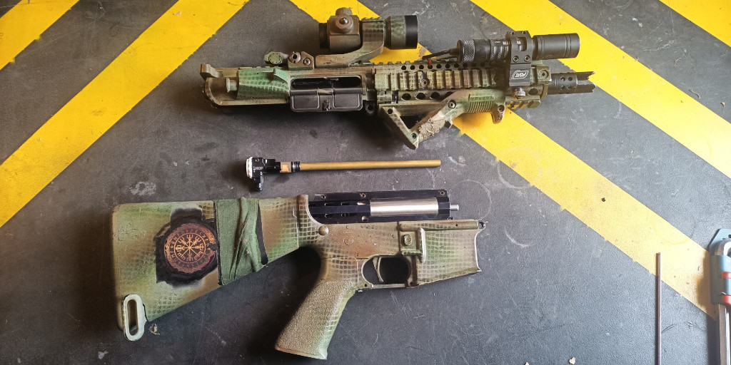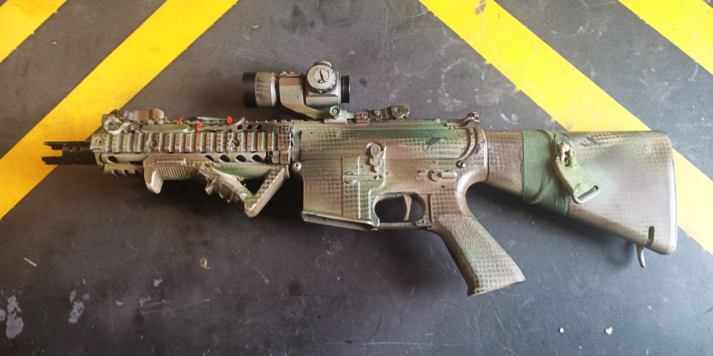 Zbraň je ve FullUp, komora a mechabox je od RetroArms, vzduch je od AirsoftParts, kola SHS (myslím že 16:1) a procesorovka Perun. Do krátké pevné pažby, která je k tělu trvale přidělaná, se vejde i velká 11.1V bateri, kterou přidám. Ke zbrani také nechám reddot, silnou svítilnu od ASG a tři zásobníky od KWA. Zásobníky mají prodloužený follower, takže využijete plnou kapacitu zásobníku (nezůstávají kuličky v šachte hop komory). Co se týká výkonu používal jsem 0,3g se kterými má 1,7J. (TFH)