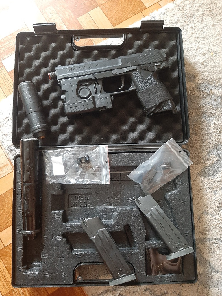 Nabizim Mk23 socom od Tokyo Marui s ,,lehkym,, upgradem. Upgrade: hadron design TDC 3plate, hop up guma modify x- range, hadron design H-arm pritlacny segment. Pouzival jsem 0,36 ale neni problem davat tezsi bb (idealne 0.40). K pistoli davam DTD pouzdro, 2 zasobniky, 2 tlumice (kratkej a origo dlouhej), nahradni hrdlo zasobniku, puvodni dily po upu, kufrik a zbyle 0,36bb.. Zbran je skvela, spolehliva a ve 100% stavu jen zasobniky to chce pretesnit ( 1 tesni ale 1 uchazi). Bohuzel uz me nebavi jeji velikost. Osobni predani olomoic nebo posta