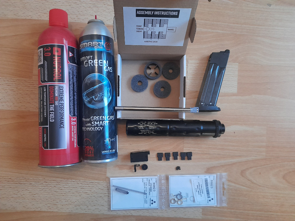 Zdravim , nabízim MK23 Tokyo Marui s konverzí . Konverze je vyrobena na 3D tisku z Black Printu , stejně tak i TDC hopup štelování přítlaku , k tomu jsou ještě na výměnu jednotlivý segmenty s červíky. Přítlačný segment hopupu od Hadron Designs. Ve zbrani je teď hlaveň Maple Leaf crazy jet 6,04mm 370mm , přikládám ještě jednu hlaveň stejné značky a typu o dýlce 150mm. Instalovaná hop gumka je taky Maple Leaf MR hop 80° a na té kratší hlavni taky ML MR hop 70°. Prodloužení vnější hlavně Maple Leaf 228mm . Tubus pažby a montáž na uchycení popruhu ICS , pažba od Specna Arms . Namontovaný tlumič Airsoftpro 210x40 mm uvnitř Epes vložky odhlučnění , zbylé kroužky přidám k tomu (na fotce).Jeden zásobník (originál bez úprav) funkční a neuchází. Ve zbrani ještě vyměněny pružinky trisky za silnější od Tridosu a stejný značky pružinka kladívka , všechny zbylé přikládám , stejně tak i ty původní. Přikládám ještě 2 lahve s plynem , Nuprol je prakticky plnej a ten druhej už pomalu na konci , nebudu je už potřebovat. Zbraň moc nenastřílela , spíš odskoušena , měl to být HPA projekt , ale už nato neni čas ani chuť . Zasílám zásilkovnou . Cena je i s poštou (200,-) ty bych při koupi chtěl zaslat předem na účet , poté odečtu z původní částky .