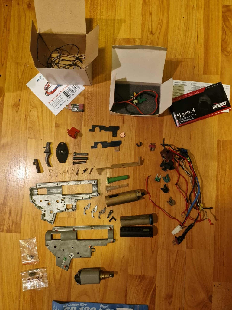 Prodám projekt který jsem nedokončil. Jedná se o MP5 vnějšek složený z VFC a SRC - některé věci jsem nahradil tim co jsem našel doma (vnitřní trubka natahovací páky+nějaké šroubky). Tělo je ocelové přežije i přejetí autem a spodek klasika plast/polymer nevim. Pažba je z origo mp5 FAB defence. Vnitřek je celý složený ASG ultimate mechabox, shs vzduch, random kola 18:1, motor vysokorychlostní U- 45000 infinity, m120 guarder, zbylé dílky shs, 2x tryska, src hop a hlaven asi TM základ, mosfet od jeftron. Je potřeba vyřešit ješte tryska a nejaké ty dílky jinak je to asi ok - tak jak to je tak to dáva cca 30+ bb/s s 11,1lipol 30C. K mp5 dávám - 5x tlačák cca 100BB, 2x točák asi Tokio marui, dále, tělo plast asi TM a 2x předpažbí a spodní část a pažbu, dále TM krytku motoru a zadní mířidlo. Náhradní src trysku a spoušť, 2x sumku, laser a sumku na baterku na pažbu a červenou krytku hlavně. Dále dam ke zbrani veškeré dílky na druhé fotce- jsou to věci co jsem k tomu plastovému tělu dostal a nebo dokoupil do te src- je tam procesorovka, mosfet a tak. Je třeba ještě něco dodělat a vyladit. Tak jak to je sem s tim na zkoušku hrál, ale měl jsem to vypodložený, aby to s tou tryskou podávalo... . Za všechny síly jsem dal cca 16000 Cenu nabídněte moje představa je cca 8000, ale nebráním se slevě při rychlém jednání.