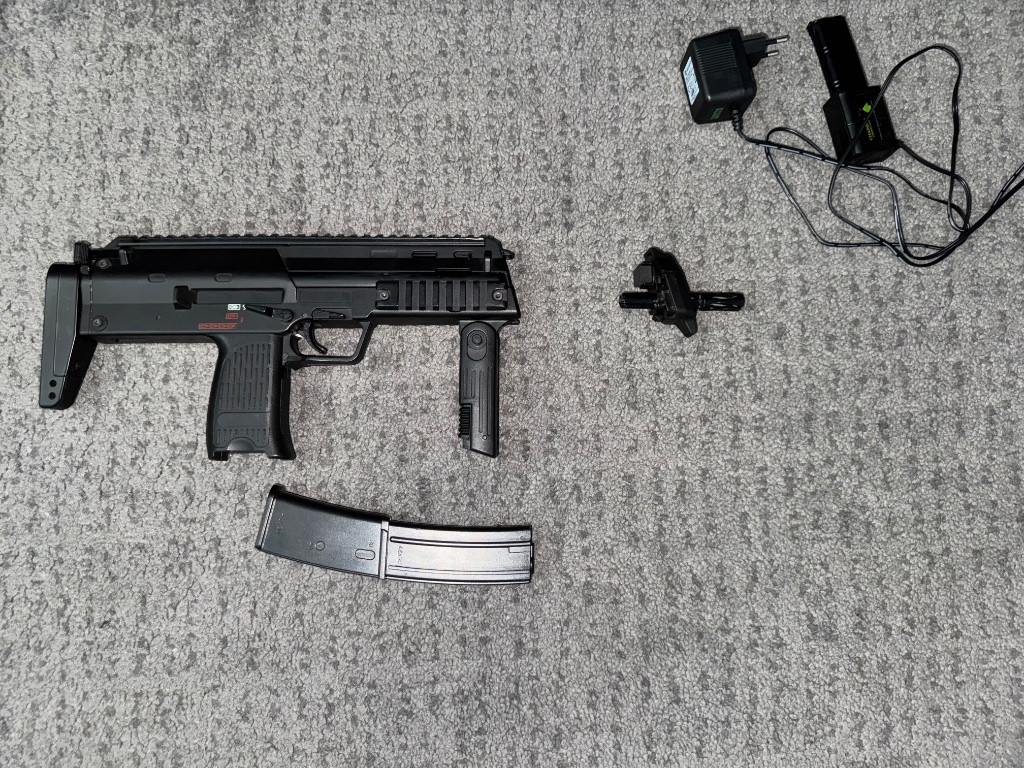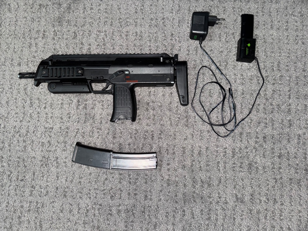 Elektrická airsoftová zbraň. Replika modelu H&K MP7 [R4] s plastovým tělem od firmy Well. Realistický AEP samopal s kovovým kompenzátorem se třemi kovovými RIS lišty pro uchycení komponentu. Součástí balení je také nabíječka, akumulátor 7,2V/450 mAh (AEP MINI), a tlačný zásobník na 30 BB.