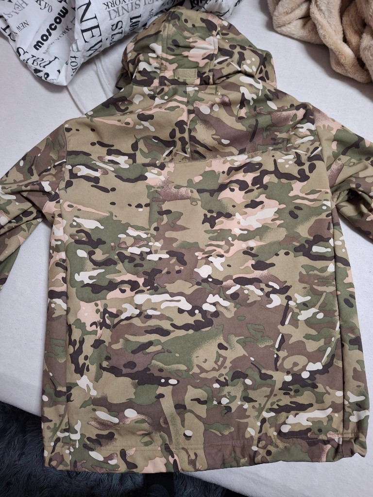 Prodám z softshellku v multicamu. Bunda je skoro nenošená. Jediná chybička je malá dírka v síťovině na vnitřní straně viz.foto. Bunda je L ale přijde mi spíš jako M. Má kapuci, která se dá srolovat do límce. Prodám z důvodu, že jsem z ní vyrostl. Původní cena 1000. Výrobce: Čína