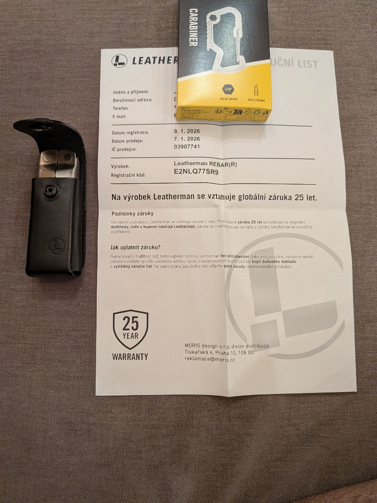 Nabízím k prodeji nový Leatherman Rebar – kompletní sada s 25letou zárukou. Nástroj je zcela nový, nepoužitý a připravený k okamžitému nanasazení. Nový kus v originálním balení. Již provedená registrace na záruku 25 let (absolutní jistota servisu). Originální kožené pouzdro Leatherman (vysoká odolnost a elegantní vzhled). Bonus: Originální karabina Leatherman součástí balení. Stručná specifikace: 17 funkčních nástrojů (vyměnitelné břity kleští, pilka, pilník, nože z oceli 420HC). Všechny nástroje jsou opatřeny bezpečnostní pojistkou. Cena 2200,- Kč, včetně Zásilkovny.