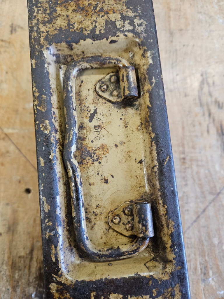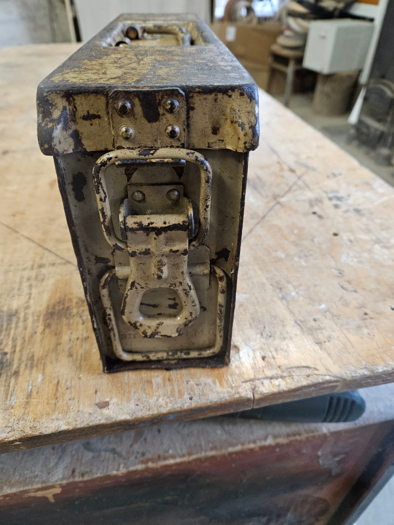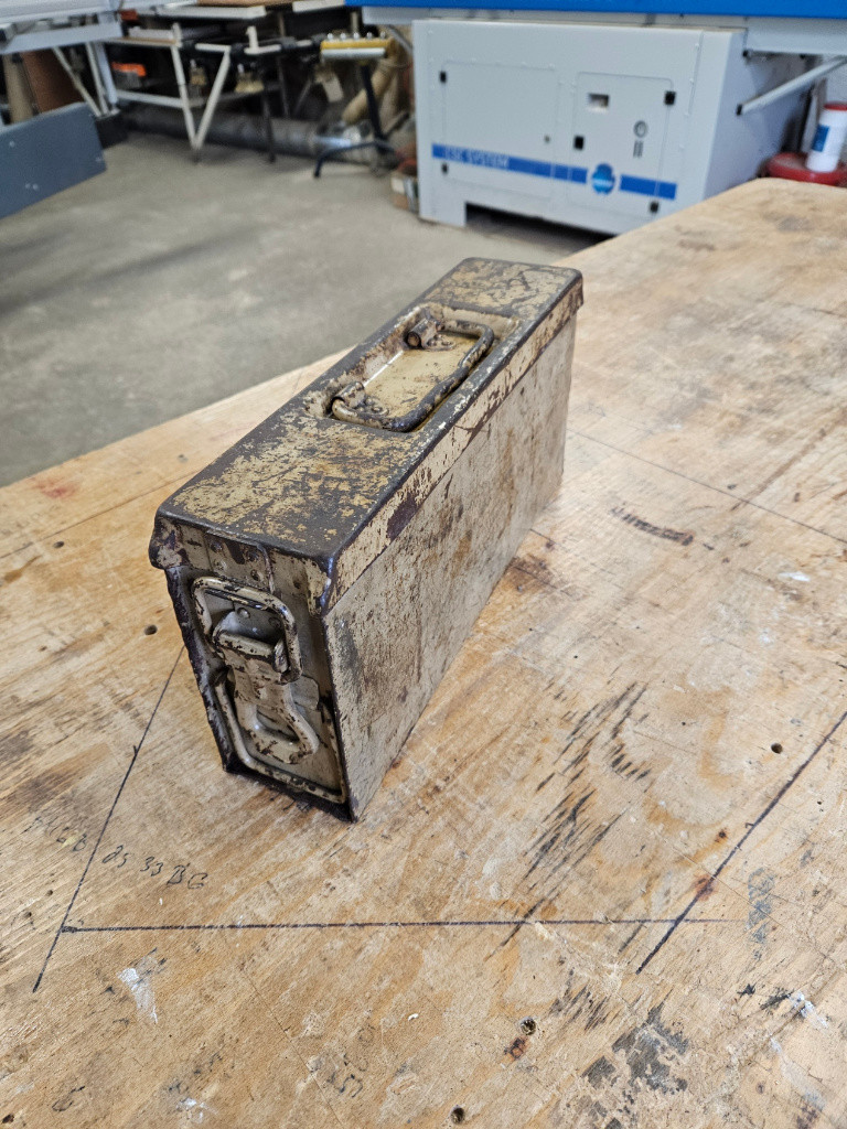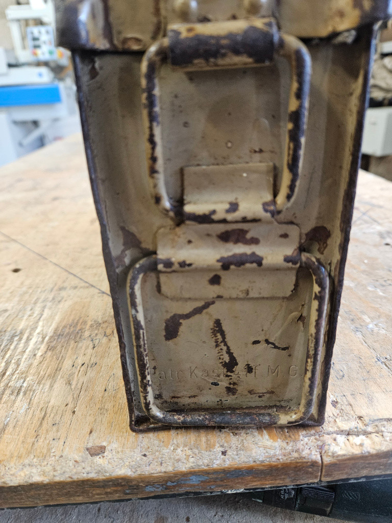 Prodám muniční bednu PATR. KAST. 41f M.G. částečně s původní barvou Afrikakorps.? Kovová (železná, původně vodotěsná) schránka na náboje ke kulometu MG34/42, značena na obou bocích : " PATR. KAST. 41f M.G." Pod držákem na horním víku je vyraženo " orc ". Bednu jsem našel na půdě starého baráku při vyklízení. Tady je odkaz na skoro stejnou bednu, jen s jiným označením na víku. https://www.ima-usa.com/products/german-mg-34-42-afrikakorps-model-41-ammunition-can-ww2-marked?variant=25652007941 Osobní odběr, nebo zásilkovna (poštovné předem). Dohoda možná.