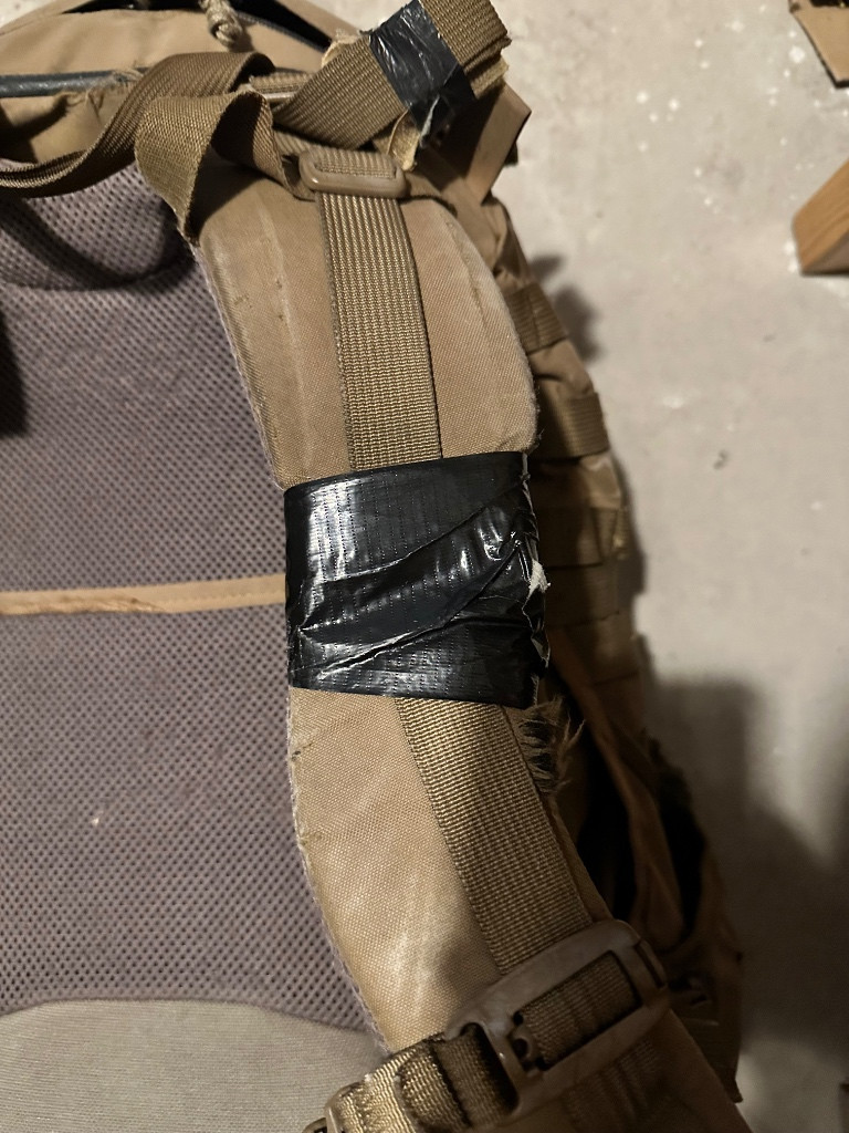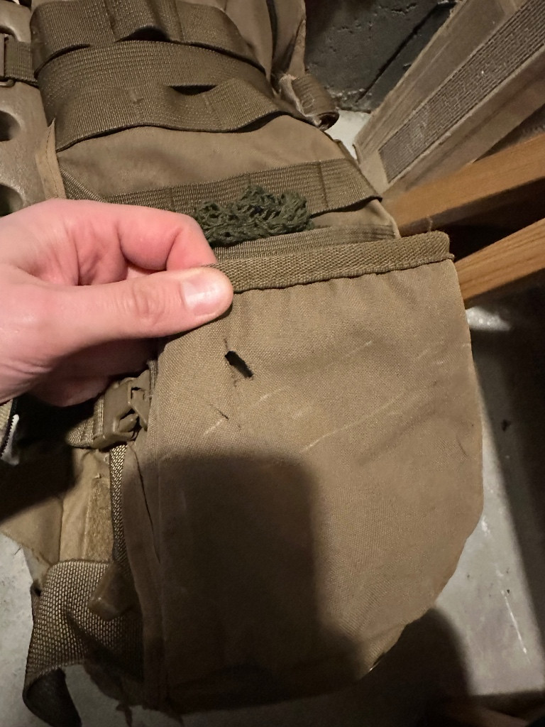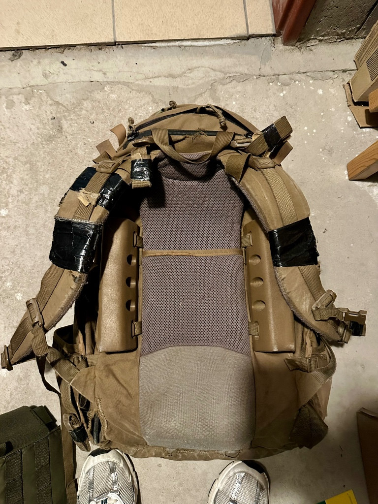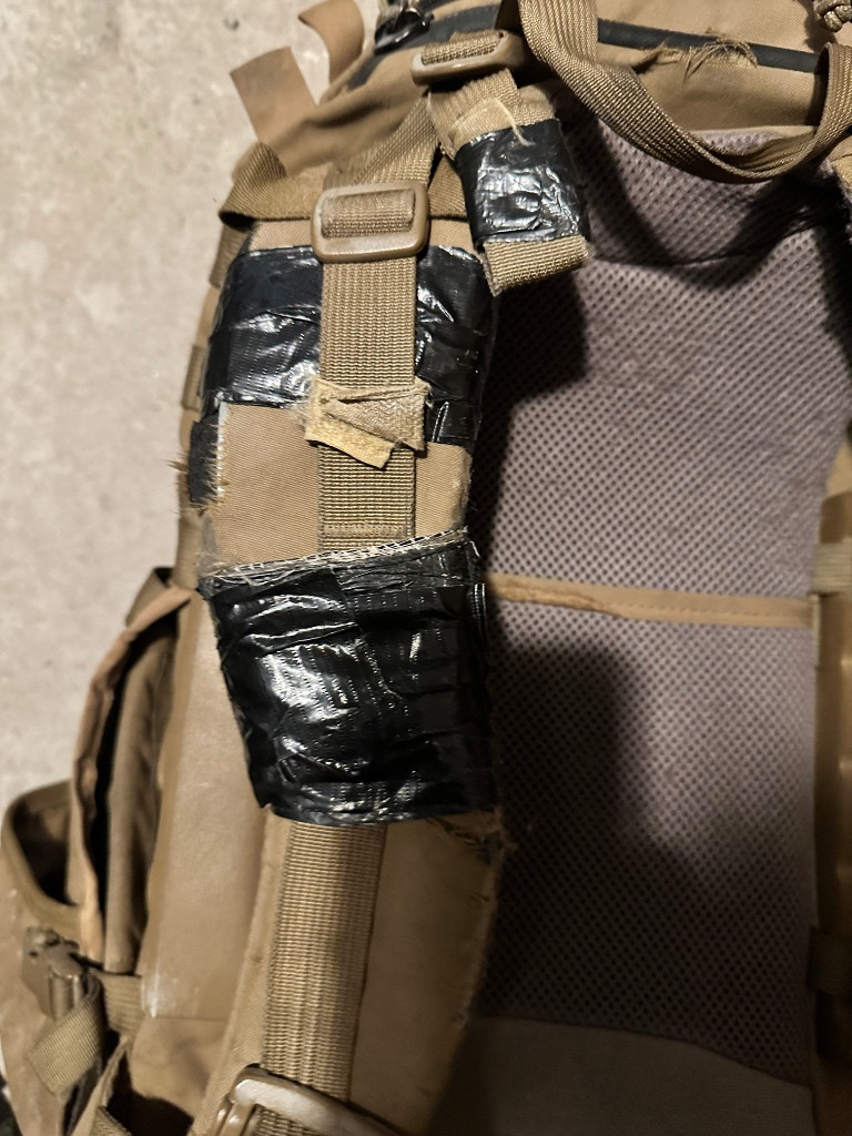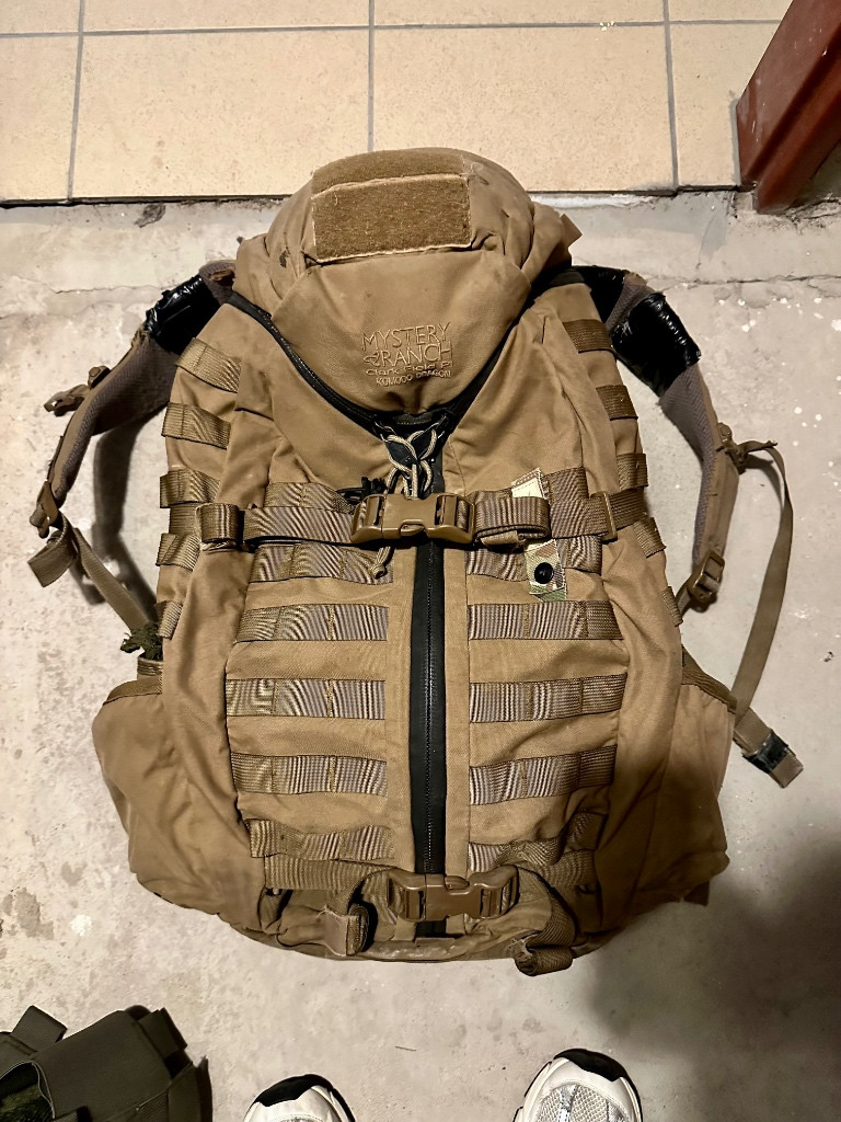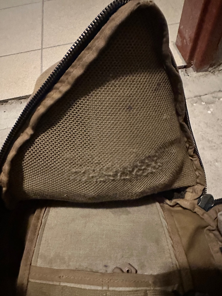 Mystery Ranch Komodo, Coy, Old gen černý zipy, BVS - není to voňavka, dírka na jedný boční kapse, spodek odrbanej, vnitřní mesh lehce odrbanej, jeden zip na vrchní kapse nezipuje, ramenní popruhy sem tam prasklý ve švu a fixnutý tejpou, uvnitř pár skvrn od používání. Nic co by vyloženě bránilo použití, 5500,-