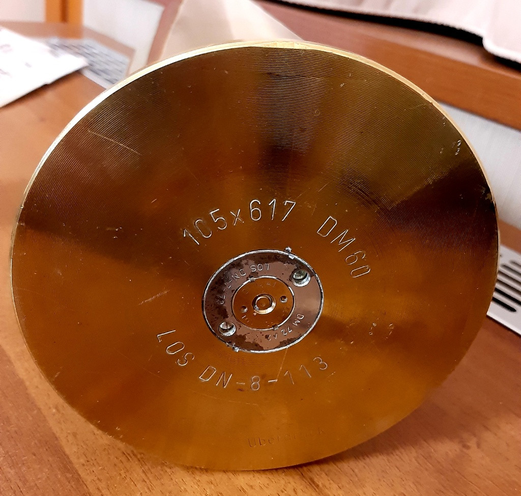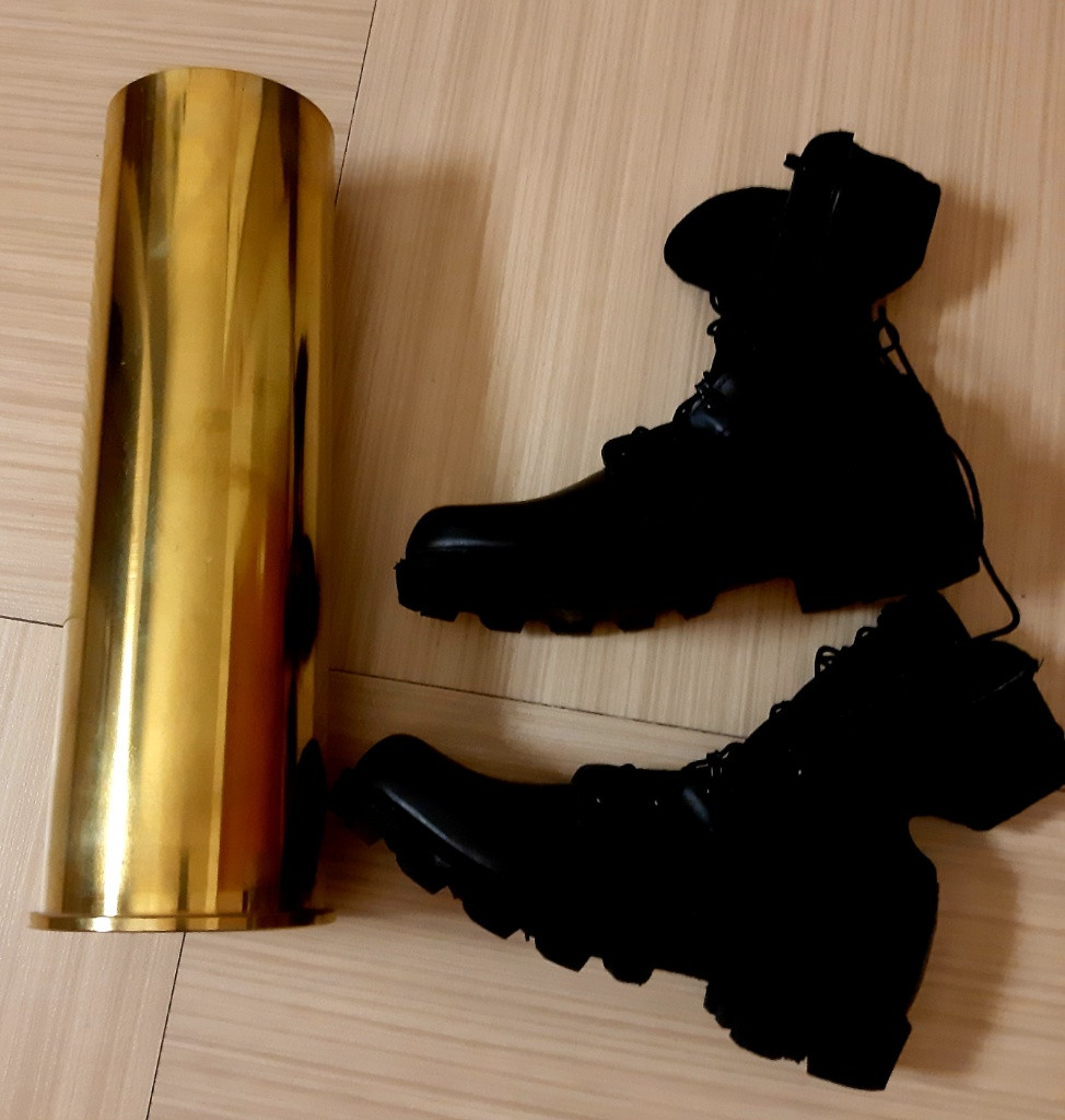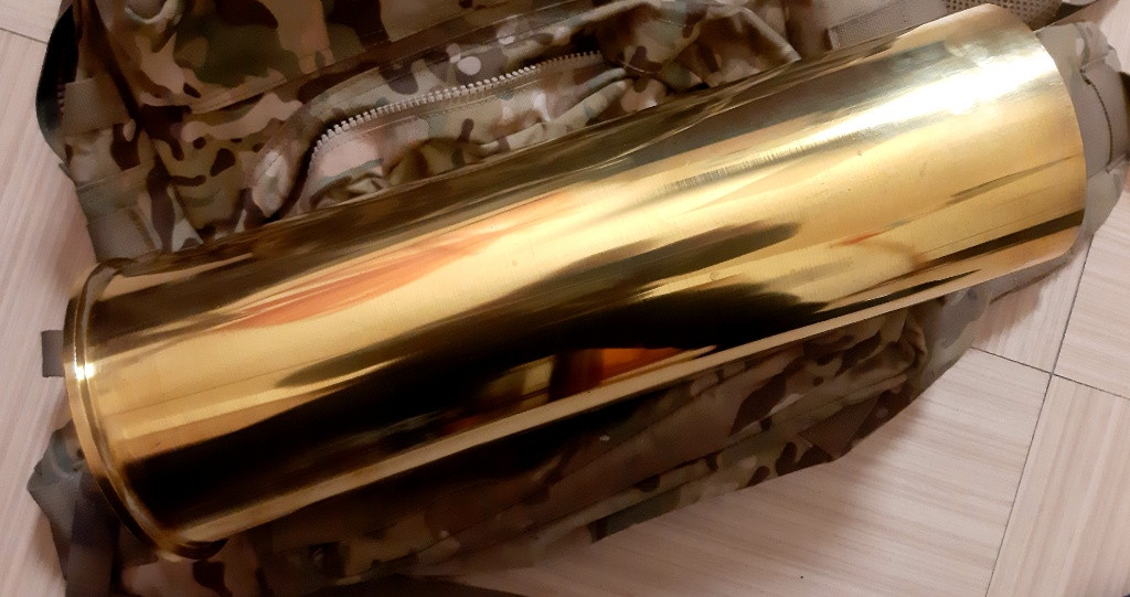 Nábojnice 105x617 DM60 z tanku Leopard 1, zkrácená na 43 cm , průměr 14.5 cm , váha asi 5 kg, vyleštěná mosaz - byla dlouho vystavena, k vidění a odběru v Berouně