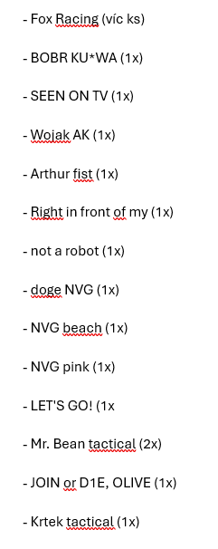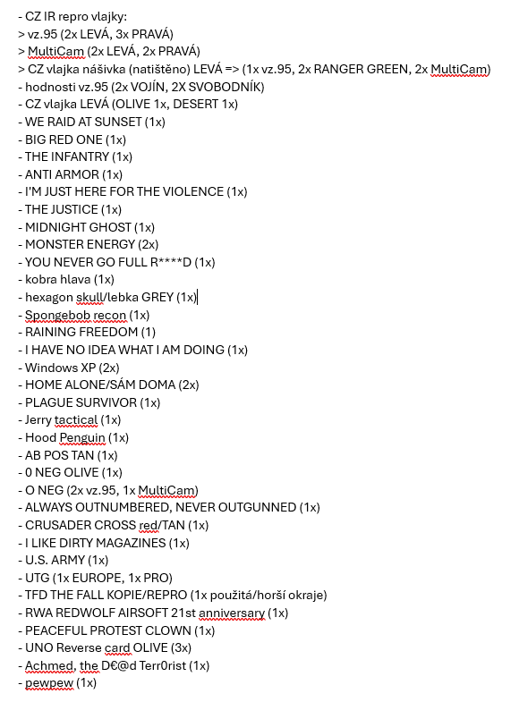 vše nové, není-li napsáno jinak; informace o počtech nášivek atd. v závorce. V TOMTO POPISKU U FOTKY JSOU AKTUÁLNÍ INFORMACE OHLEDNĚ DOSTUPNOSTI. seznam nášivek: - CZ IR repro vlajky: > vz.95 (2x LEVÁ, 3x PRAVÁ) > MultiCam (2x LEVÁ, 2x PRAVÁ) > CZ vlajka nášivka (natištěno) LEVÁ => (1x vz.95, 2x RANGER GREEN, 2x MultiCam) - hodnosti vz.95 (2x VOJÍN, 2X SVOBODNÍK) - CZ vlajka LEVÁ (OLIVE 1x, DESERT 1x) - WE RAID AT SUNSET (1x) - BIG RED ONE (1x) - THE INFANTRY (1x) - ANTI ARMOR (1x) - I'M JUST HERE FOR THE VIOLENCE (1x) - THE JUSTICE (1x) - MIDNIGHT GHOST (1x) - MONSTER ENERGY (2x) - YOU NEVER GO FULL R****D (1x) - kobra hlava (1x) - hexagon skull/lebka GREY (1x) - Spongebob recon (1x) - RAINING FREEDOM (1) - I HAVE NO IDEA WHAT I AM DOING (1x) - Windows XP (2x) - HOME ALONE/SÁM DOMA (2x) - PLAGUE SURVIVOR (1x) - Jerry tactical (1x) - Hood Penguin (1x) - AB POS TAN (1x) - 0 NEG OLIVE (1x) - O NEG (2x vz.95, 1x MultiCam) - ALWAYS OUTNUMBERED, NEVER OUTGUNNED (1x) - CRUSADER CROSS red/TAN (1x) - I LIKE DIRTY MAGAZINES (1x) - U.S. ARMY (1x) - UTG (1x EUROPE, 1x PRO) - TFD THE FALL KOPIE/REPRO (1x použitá/horší okraje) - RWA REDWOLF AIRSOFT 21st anniversary (1x) - PEACEFUL PROTEST CLOWN (1x) - UNO Reverse card OLIVE (3x) - Achmed, the D€@d Terr0rist (1x) - pewpew (1x) - Fox Racing (víc ks) - BOBR KU*WA (1x) - SEEN ON TV (1x) - Wojak AK (1x) - Arthur fist (1x) - Right in front of my (1x) - not a robot (1x) - doge NVG (1x) - NVG beach (1x) - NVG pink (1x) - LET'S GO! (1x - Mr. Bean tactical (2x) - JOIN or D1E, OLIVE (1x) - Krtek tactical (1x) ================================== DALŠÍ FOTKY NA PŘÁNÍ, PLATÍ DO SMAZÁNÍ ================================== PROHLÉDNĚTE SI I MOJE DALŠÍ INZERÁTY! :) ================================== AKTUÁLNÍ INFO V ODKAZE NA VEŘEJNÉ ALBUM NA FACEBOOKU ================================== https://www.facebook.com/media/set/?set=a.2046721925408981&type=3 VŠE SKLADEM (není-li napsáno jinak) VŠE SE SUCHÝM ZIPEM/VELCREM MOŽNO ZAJISTIT DALŠÍ NÁŠIVKY, STAČÍ NAPSAT ZPRÁVU