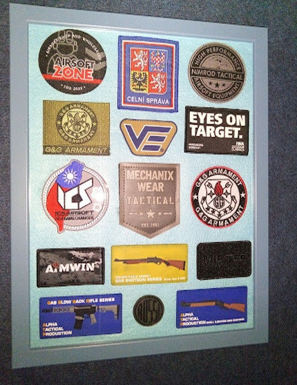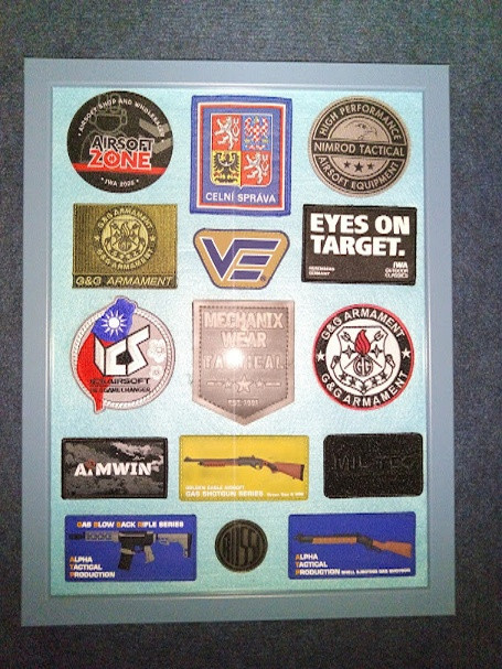 Sběratelské nášivky airsoft, zbraně, outdoor a jiné zarámované do obrazu. 15 ks nášivek. 30x40xcm