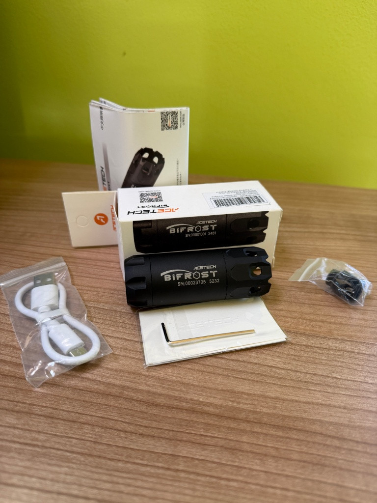 Zánovní, plně funkční, bez poškození, Inovativní nasvětlovací tlumič BIFROST značky Acetech s vícebarevnou imitací výšlehu plamene. Nasvětlovací tlumič je určen pro zelené nasvětlovací kuličky - v nabídce níže. Při každém výstřelu tlumič senzory rozezná prolétající kuličku a krátce výbojkou zableskne. Tím kuličku nasvítí a kulička během letu v noci způsobuje fantastický efekt. Je vidět po celou dráhu letu a imituje nasvětlovací střelivo, tzv "stopovky". Nejzajímavější funkcí Bifrostu je však simulace záblesku z ústí hlavně při výstřelu s efektem vícebarevného plamene. Efekt plamene závisí na objemu plynu nebo mlhy v okolí ústí hlavně, čím větší objem je, tím je efekt větší. Na konci tlumiče jsou umístěny 3 LED diody, které při výstřelu nasvítí odlétající kuličku a plyn v okolí hlavně. Výšleh je nejlépe viditelný při použití na plynových zbraních, kdy jsou nasvíceny zbytky plynu po výstřelu. Efekt je viditelný i při použití na elektrických zbraních, i když o něco slaběji. U Bifrostu si navíc můžete zvolit s jakou barvou a v jakém módu bude imitace výšlehu. K dispozici jsou 2 režimy nasvětlování a celkem 11 variant imitací plamene - od jednotlivých barev, přes RGB, Rainbow a Dynamic Rainbow mód. REŽIMY NASVĚTLOVÁNÍ STANDARD - každá kulička je nasvětlena a je možné používat imitaci plamene SNIPER - nasvětlena je každá třetí kulička a imitace plamene je vypnuta, aby nedošlo k prozrazení střelce VYPNUTO - režim nasvětlování je vypnutý a je možné používat imitaci plamene REŽIMY IMITACE VÝŠLEHU PLAMENE JEDNOTLIVÉ BARVY - imitace plamene ve zvolené barvě (červená, oranžová, žlutá, zelená, modrá, růžová, fialová) RGB - imitace plamene v barvách RGB RAINBOW - imitace plamene ve všech barvách vytvářející efekt duhy DYNAMIC RAINBOW - imitace plamene v dynamicky se měnících barvách (změna barvy každých 0,5 vteřin) DEMO - každý režim imitace je aktivní po dobu 5 výstřelů a Dynamic Rainbow na jednu dávku VYPNUTO VÝDRŽ Nasvětlování s imitací plamene (na jedno nabití až 12 000 kuliček) Pouze imitace plamene (na jedno nabití až 12 000 kuliček) Pouze nasvětlování (na jedno nabití až 24 000 kuliček) Bifrost má inteligentní správu energie - po 5 minutách nečinnosti se automaticky přepne do režimu spánku. Pro probuzení stačí tlumičem zatřást. Pomocí zapínací tlačítka lze také samozřejmě zcela vypnout. Nasvětlovací jednotka je uložena napevno v hliníkovém pouzdře s matným eloxovaným povrchem. Je napájená vnitřní Li-Ion baterií, která plně nabitá nasvítí až 24 000 kuliček nebo 12 000 při režimu nasvětlování a imitaci plamene. Pro nabíjení akumulátoru je třeba odšroubovat koncovku tlumiče a připojit USB-C kabel (součástí balení). Pod koncovkou naleznete i zapínací tlačítko. Stav tlumiče (zapnuto, napětí baterie, výsledek autotestu) je signalizován barevným problikáváním LED. Součástí balení je redukce z levotočivého závitu M14 na pravotočivý M11, takže tlumič můžete použít na jakoukoliv airsoftovou zbraň, která má odšroubovatelný tlumič plamene. Pro snazší utahování / povolování redukce je přiložen i imbus. SPECIFIKACE Plně nabitý akumulátor (Li-Ion) nasvítí až 24 000 kuliček (režim pouze nasvětlování nebo pouze imitace plamene) Doba nabíjení akumulátoru 2,5 hodiny Jednotka je plně funkční do kadence 35 RPS (střel za vteřinu) Určen pro zelené nasvětlovací kuličky Funkce automatického uspání po 5 min nečinnosti, pro zapnutí stačí jednotkou zatřást Indikátor stavu baterie pomocí LED diody (zelená/oranžová/ červená) Levotočivý závit M14 Obsah balení : redukce M14 (-) na M11 (+), nabíjecí USB-C kabel, imbus, návod Rozměry : průměr 30 mm, délka 81 mm Váha : 61 g (bez adaptéru)