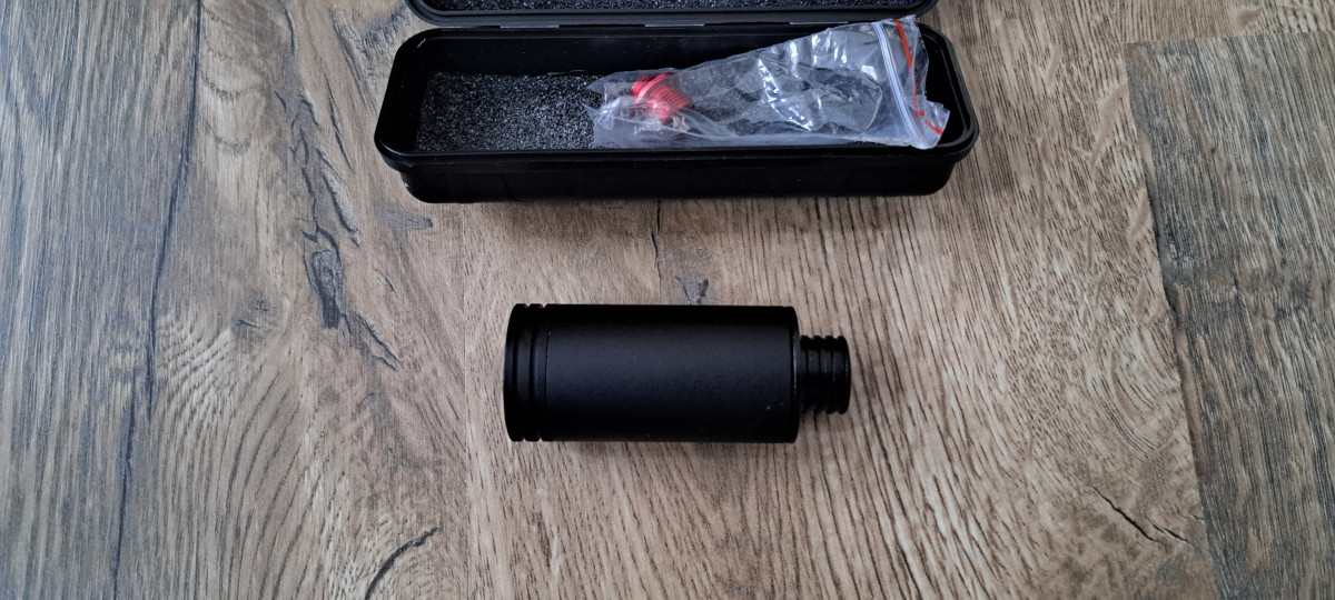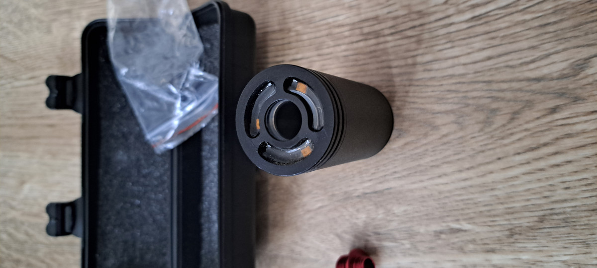 Prodám nasvětlovací tlumič s možností nasvětlení kulí nebo simulaci zášlehu hlavně. Hrán pouze jednou. nabíjení přes interní baterii. Přídám přechodku na pistolové závity