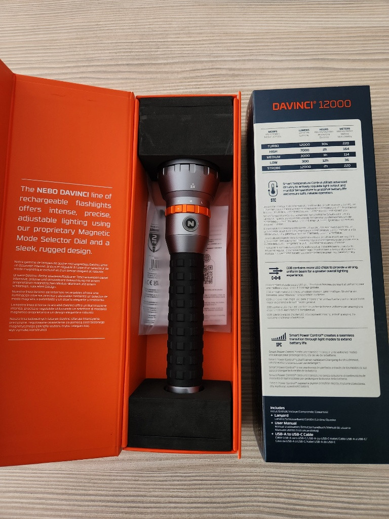 NEBO Davinci svítilna 12000 . Prodám zcela novou značkovou svítilnu NEBO o výkonu 12.000 lumenů,hliníkovým tělem,odolností IP67,nabíjecí baterii. Běžná cena kolem 4000kč vis foto,můžete si zadat sami do srovnávače cen.Na YouTube najdete videa s touto svítilnou. Prodám za 2700kč + Zásilkovna na dobírku.